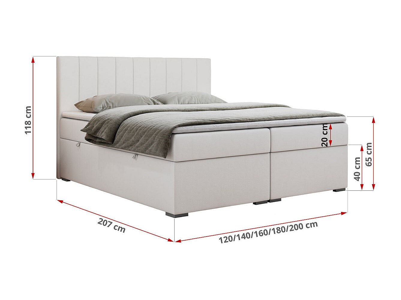 Boxspringbett LOPE - genähtes Kopfteil, Doppelbett mit Stauraum, Multipocket-Matratze, Topper - 140x200 cm - H3 - Weiß Kunstleder