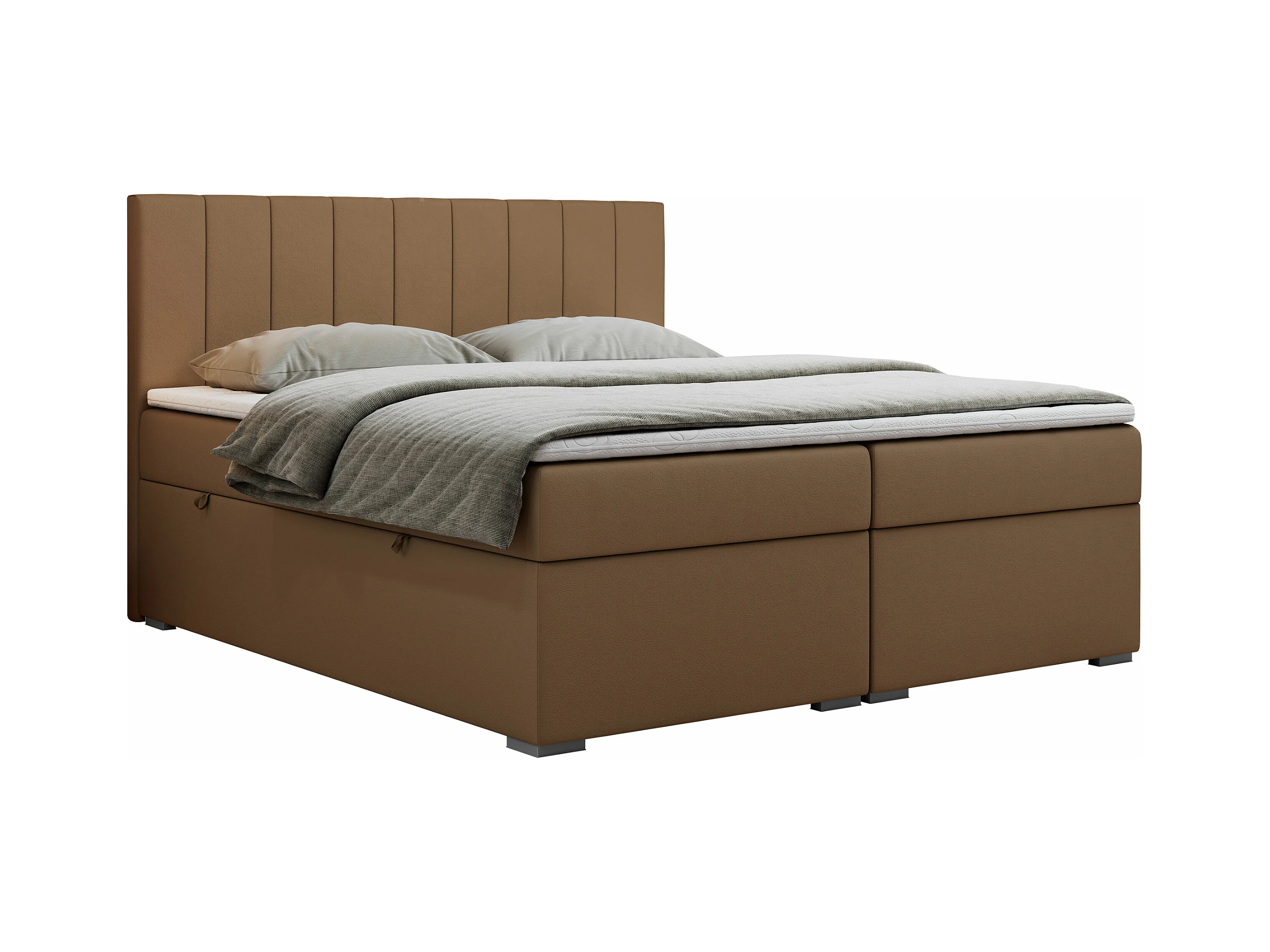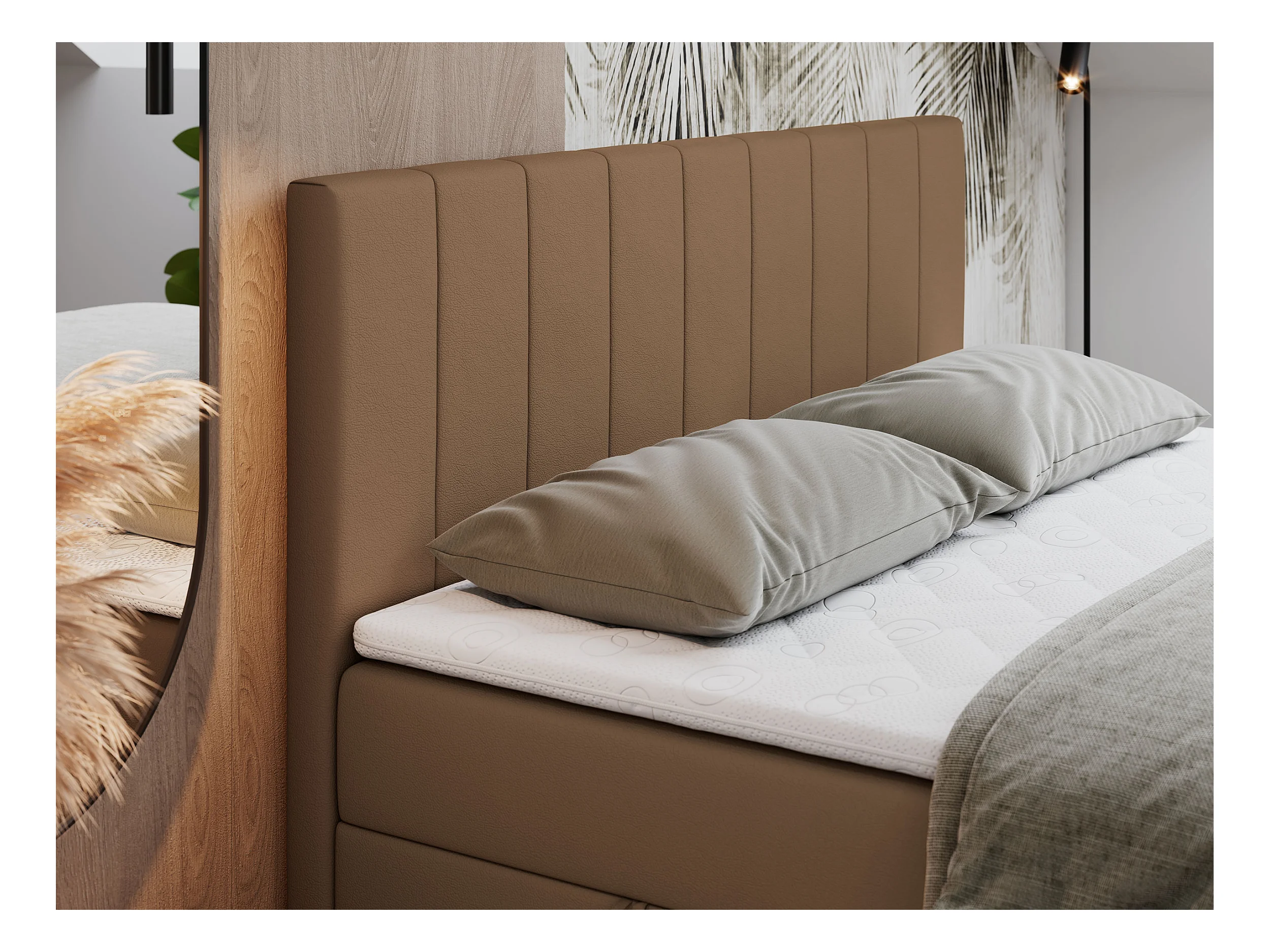 Boxspringbett LOPE - genähtes Kopfteil, Doppelbett mit Stauraum, Multipocket-Matratze, Topper - 140x200 cm - H4 - Braun Kunstleder