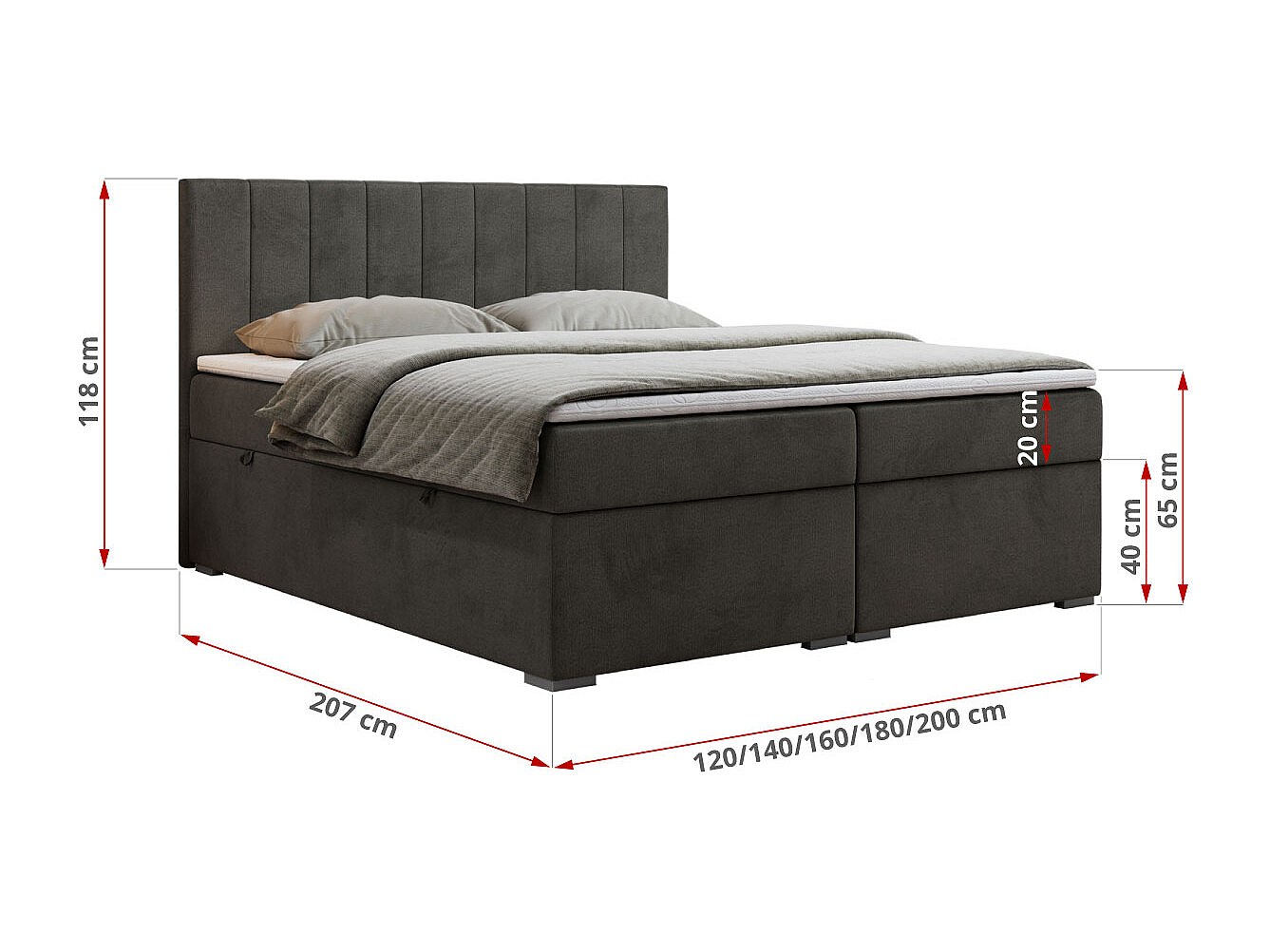 Boxspringbett LOPE - genähtes Kopfteil, Doppelbett mit Stauraum, Multipocket-Matratze, Topper - 140x200 cm - H4 - Dunkelgrau Velvet