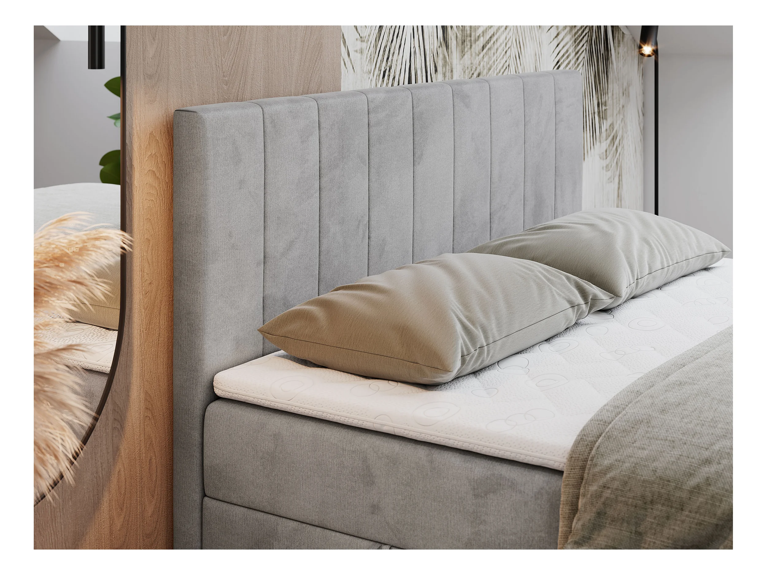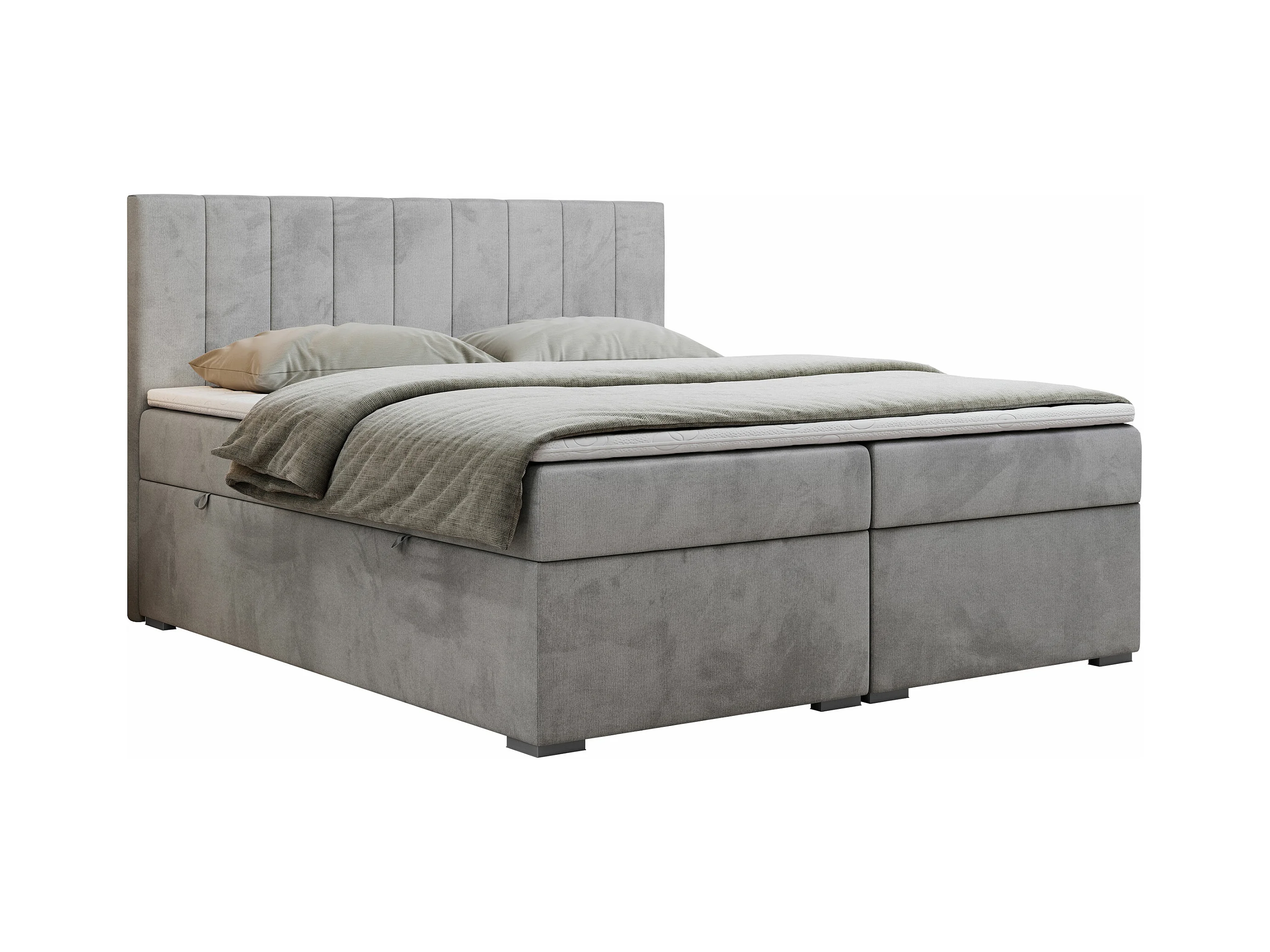 Boxspringbett LOPE - genähtes Kopfteil, Doppelbett mit Stauraum, Multipocket-Matratze, Topper - 140x200 cm - H4 - Hellgrau Velvet