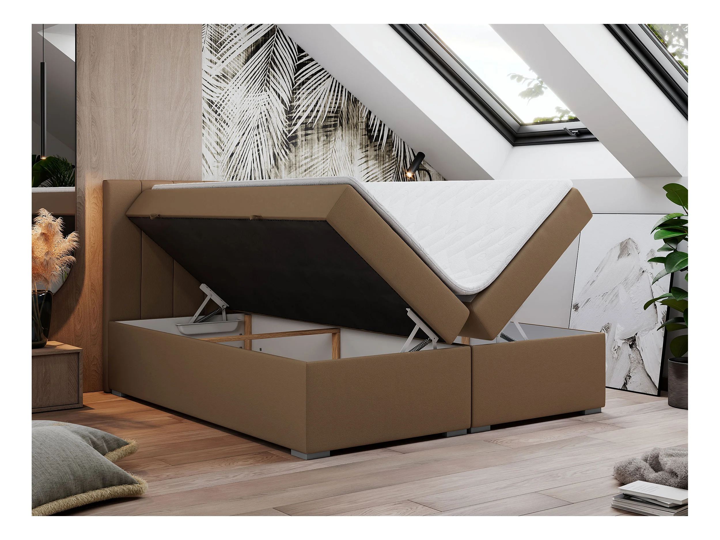 Boxspringbett LOPE - genähtes Kopfteil, Doppelbett mit Stauraum, Multipocket-Matratze, Topper - 160x200 cm - H3 - Braun Kunstleder