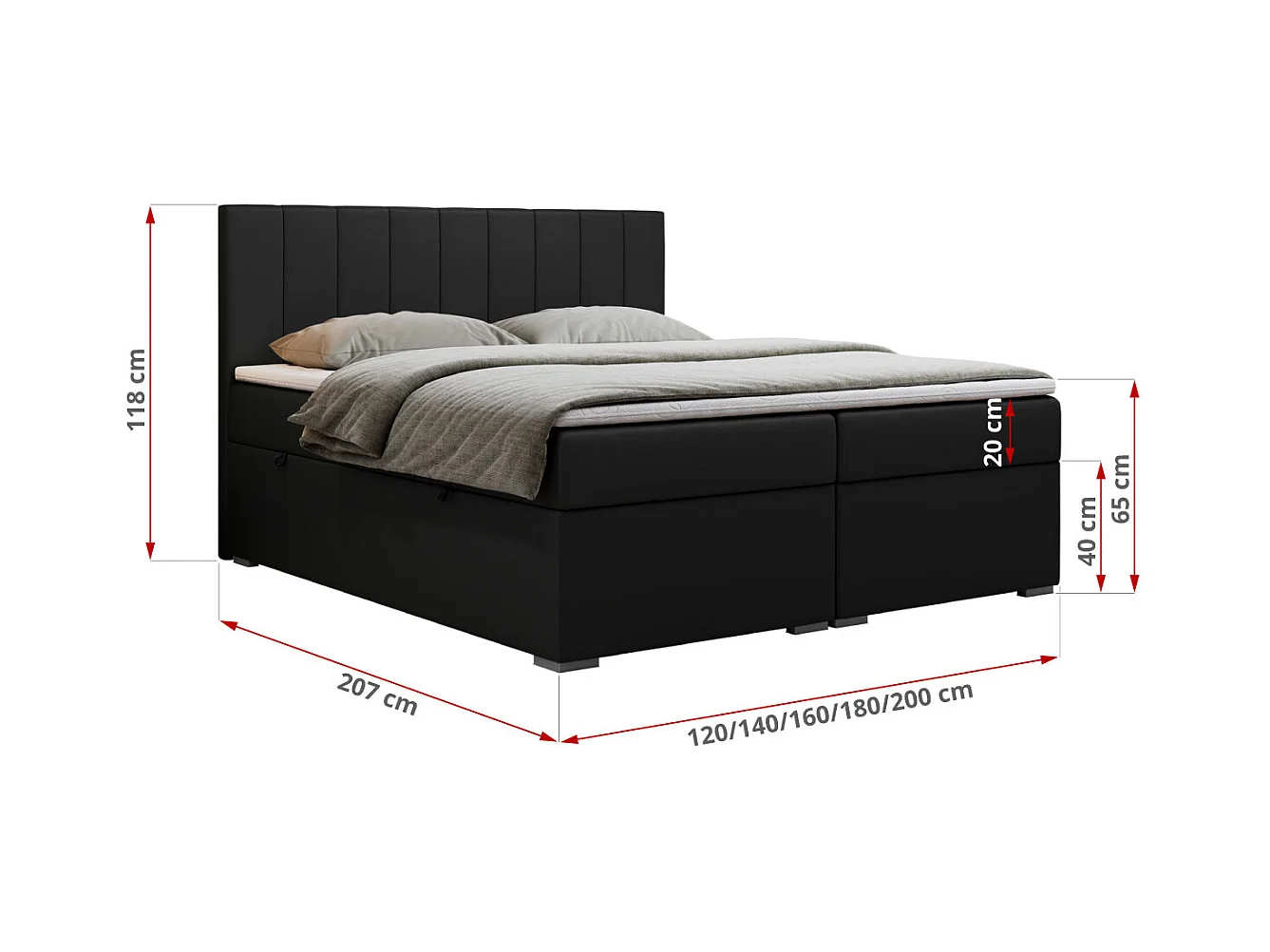 Boxspringbett LOPE - genähtes Kopfteil, Doppelbett mit Stauraum, Multipocket-Matratze, Topper - 160x200 cm - H3 - Schwarz Kunstleder