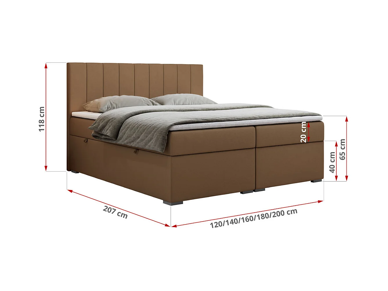 Boxspringbett LOPE - genähtes Kopfteil, Doppelbett mit Stauraum, Multipocket-Matratze, Topper - 180x200 cm - H3 - Braun Kunstleder