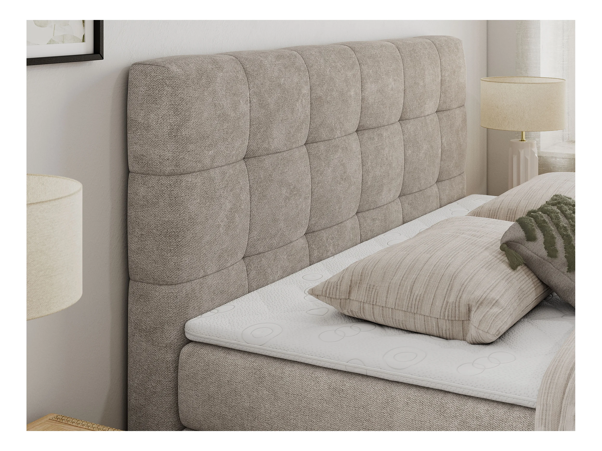 Boxspringbett LUKA KING, mit gestepptem Kopfteil, zwei Bettkästen, Multipocket-Matratze und Topper - 180x200 cm - H3 - Beige Strukture