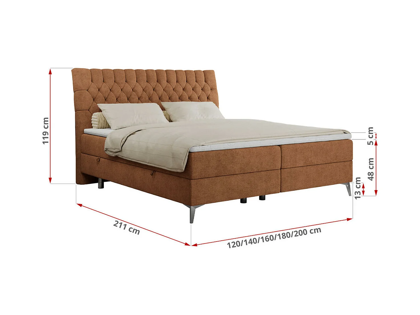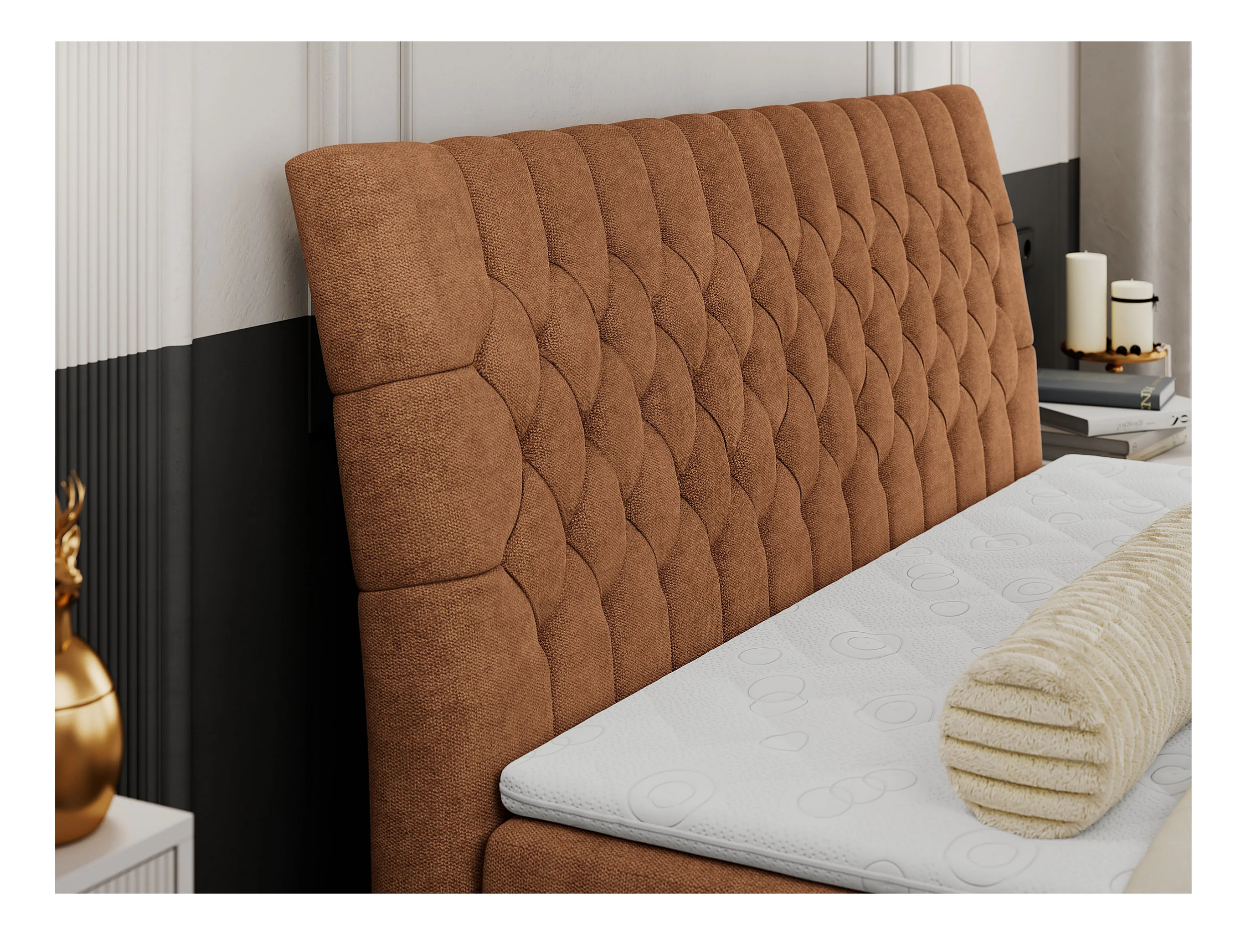 Boxspringbett MILEN - gepolstertes Schlafzimmerbett, zwei Multipocket-Matratze, dekorative hohe Beine - 120x200 cm - H4 - Orange Strukture