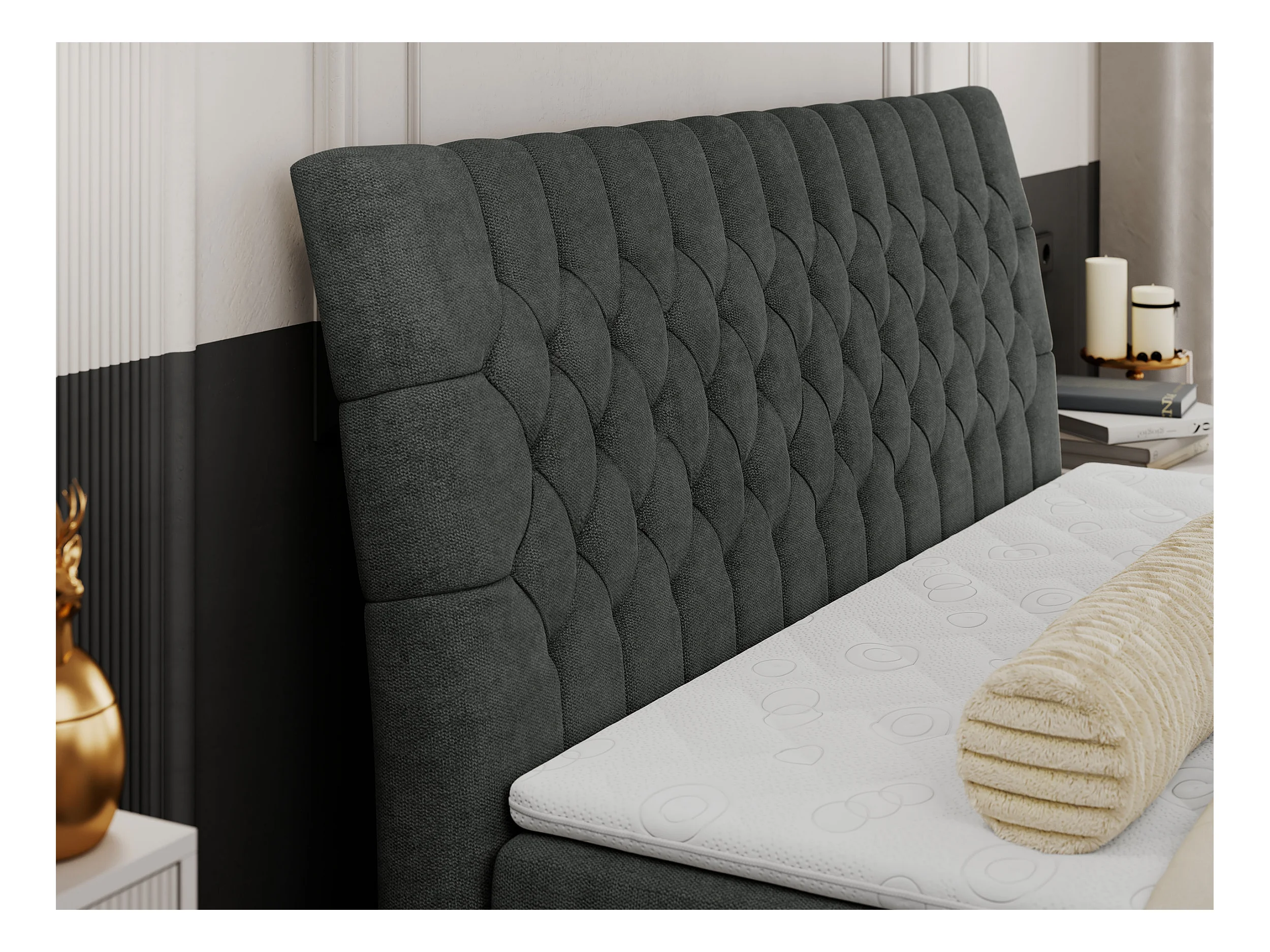 Boxspringbett MILEN - gepolstertes Schlafzimmerbett, zwei Multipocket-Matratze, dekorative hohe Beine - 180x200 cm - H3 - Dunkelgrau Strukture