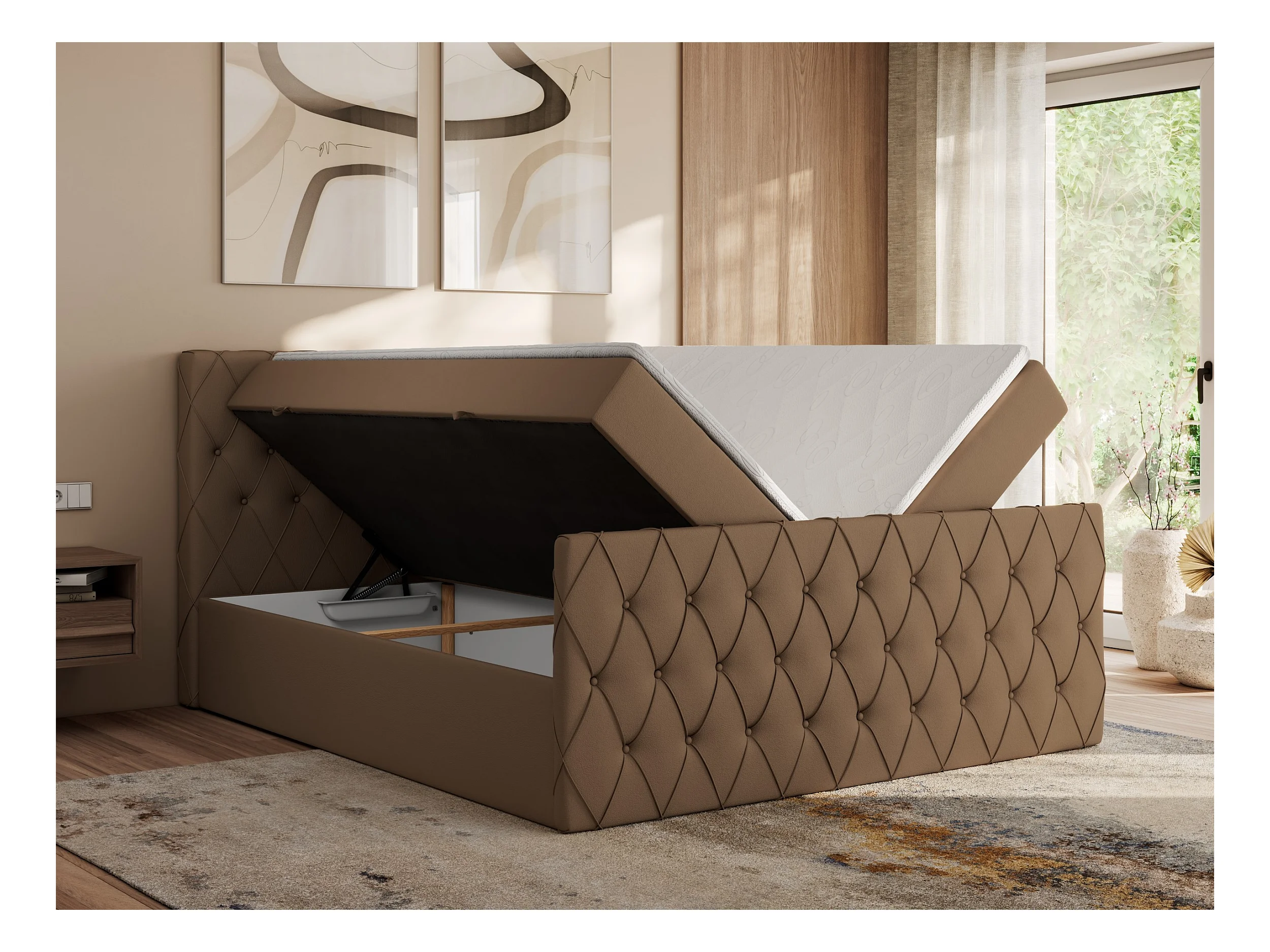 Boxspringbett MIREN DUO - mit gestepptem Kopfteil und Front, Multipocket-Matratze, zwei Bettkästen - 160x200 cm - H4 - Braun Kunstleder