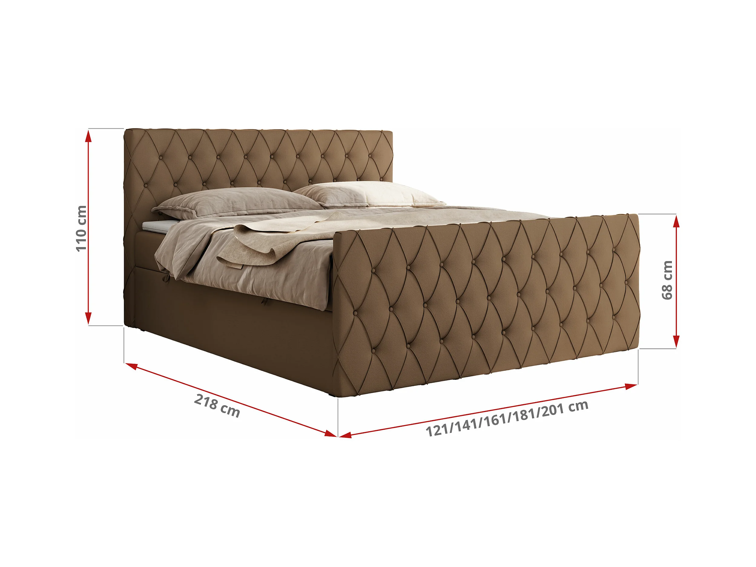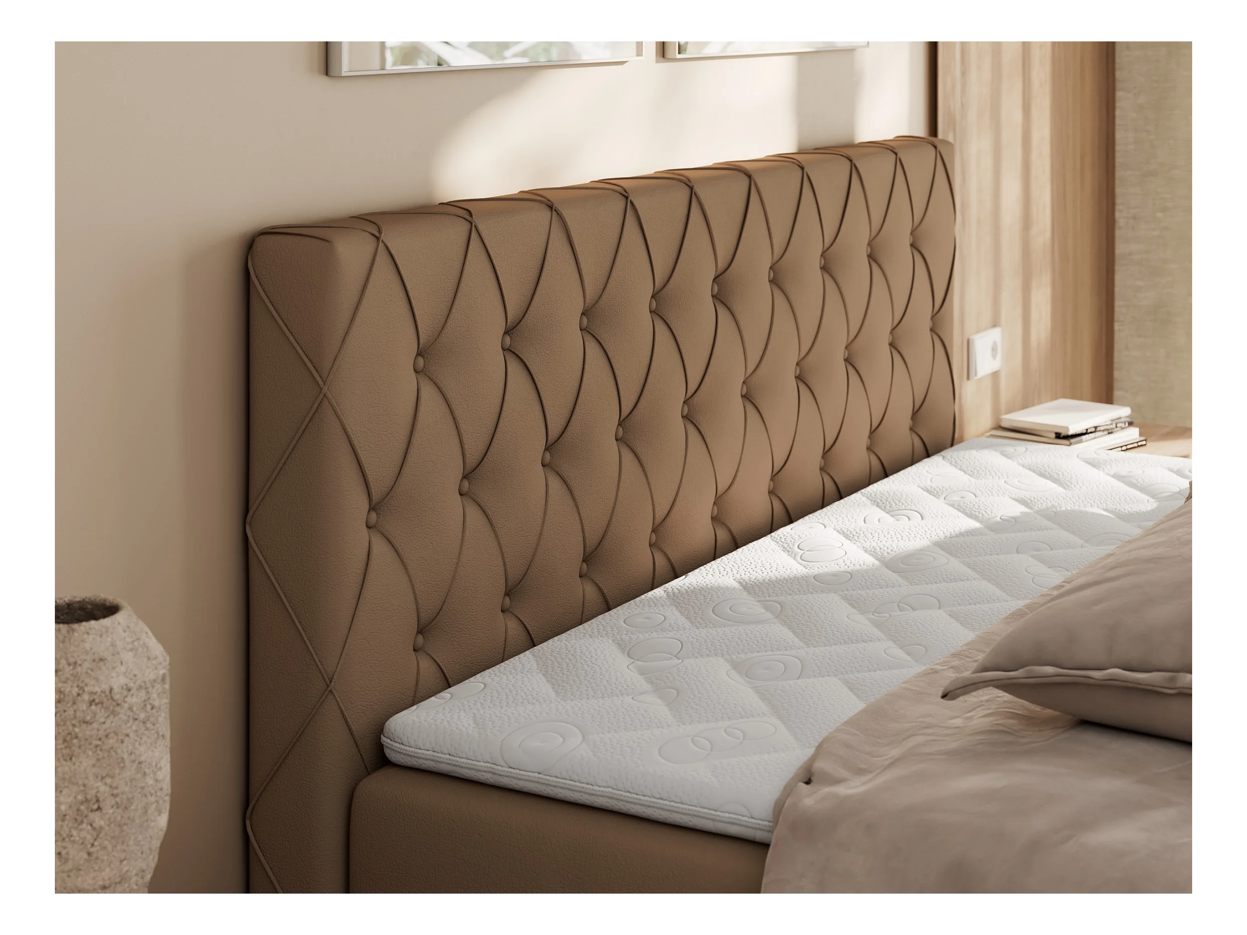 Boxspringbett MIREN DUO - mit gestepptem Kopfteil und Front, Multipocket-Matratze, zwei Bettkästen - 180x200 cm - H3 - Braun Kunstleder