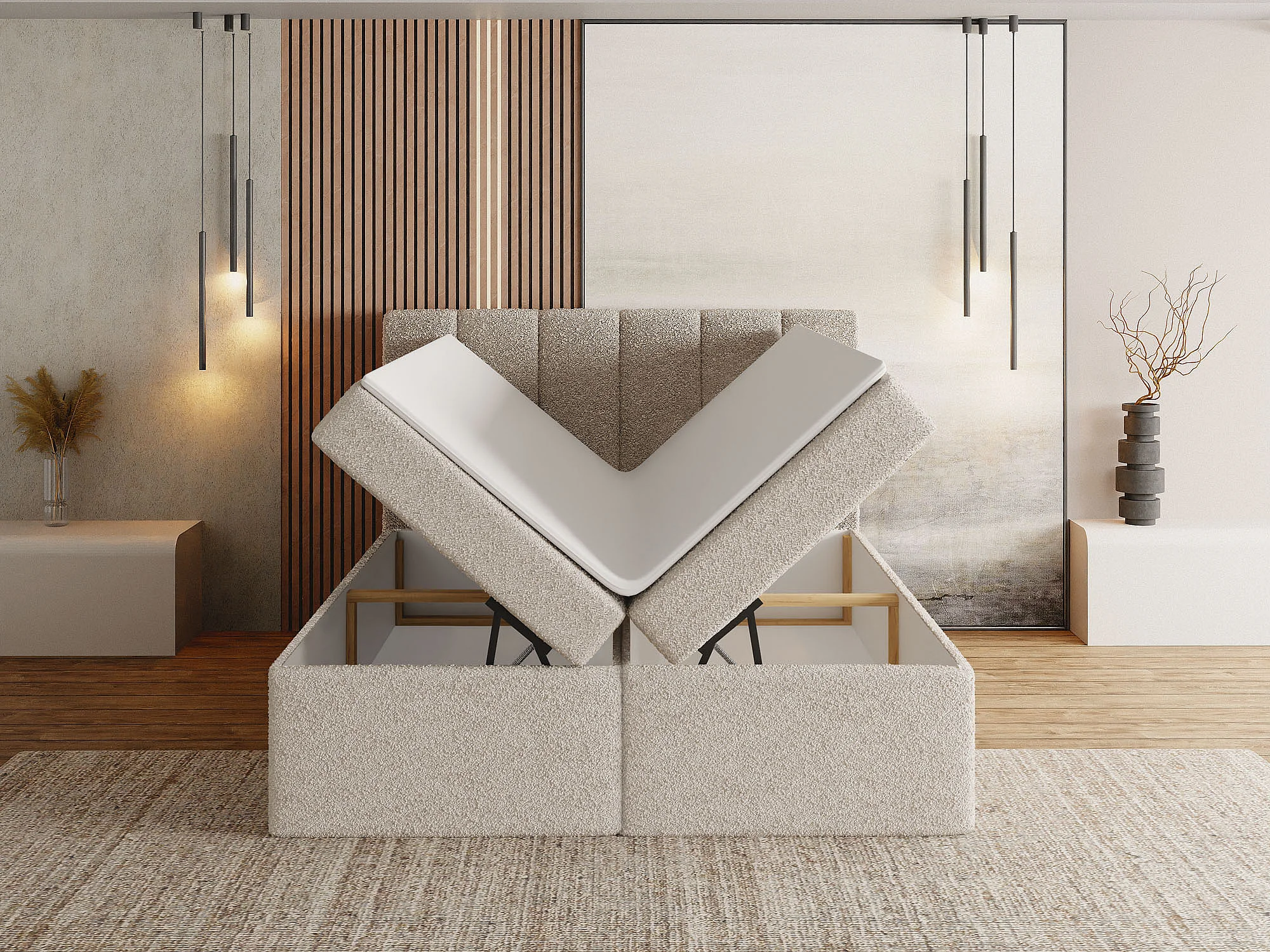 Boxspringbett mit Stauraum 160x200 – Komplett Set mit Matratze, Topper & Kopfteil – Bouclé Stoff in Weiß – Doppelbett Amira – Creme