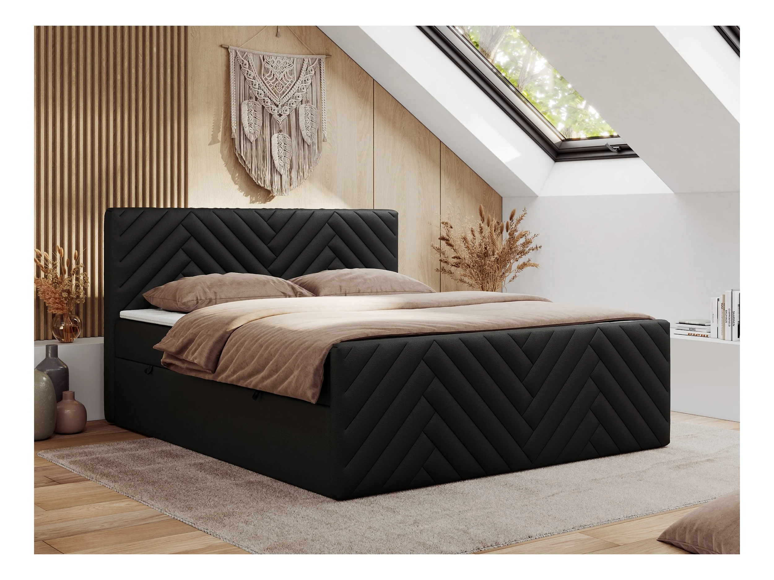 Boxspringbett PARIS DUO - Polsterbett mit genähtem Kopfteil und Frontplatte, Doppelbett, zwei Bettkästen - 200x200 cm - H3 - Schwarz Kunstleder