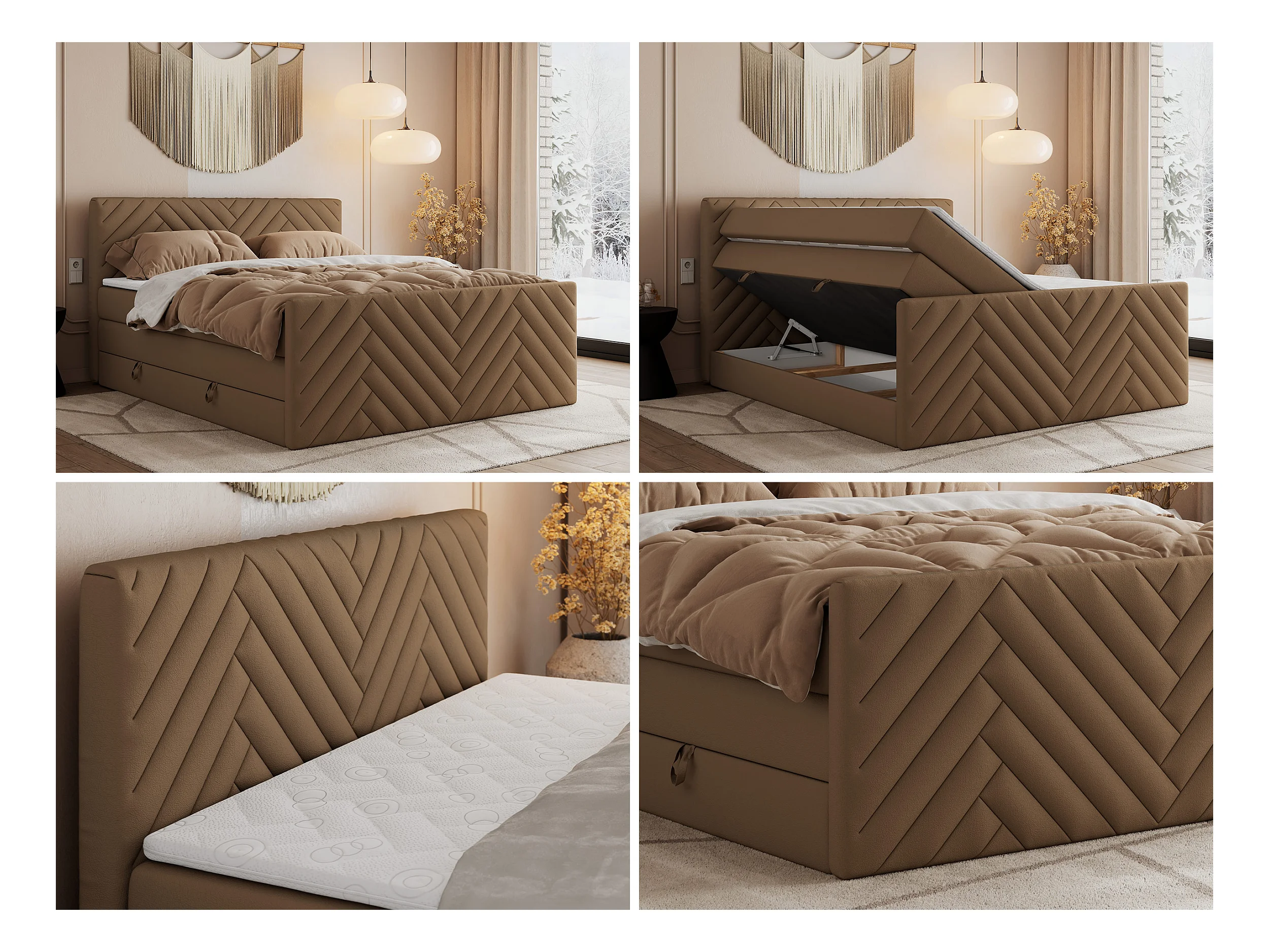 Boxspringbett PARIS KING DUO - dekorative Kopfstütze und Front, zwei Multipocket-Matratze mit Topper - 140x200 cm - H4 - Braun Kunstleder