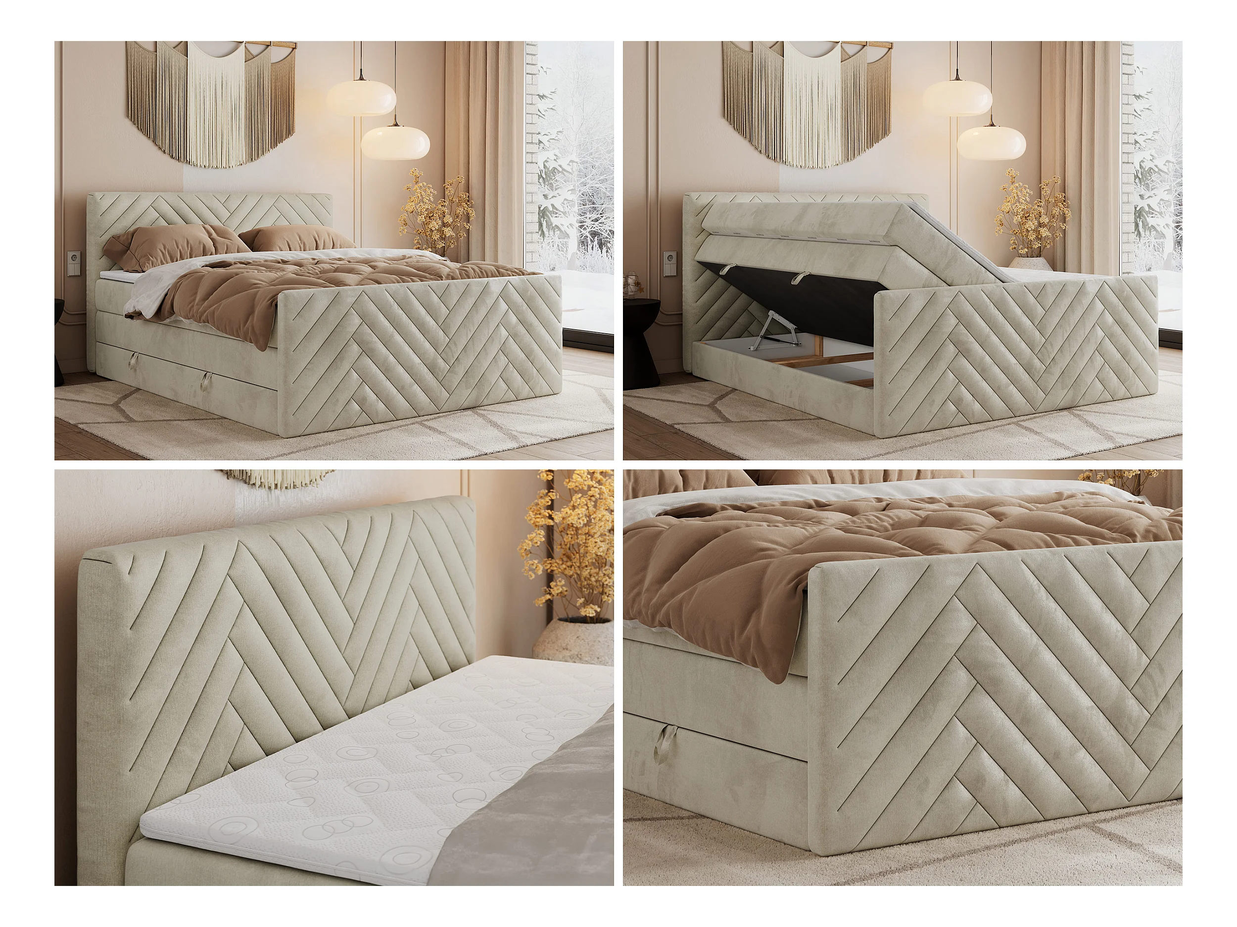 Boxspringbett PARIS KING DUO - dekorative Kopfstütze und Front, zwei Multipocket-Matratze mit Topper - 180x200 cm - H4 - Beige Velvet