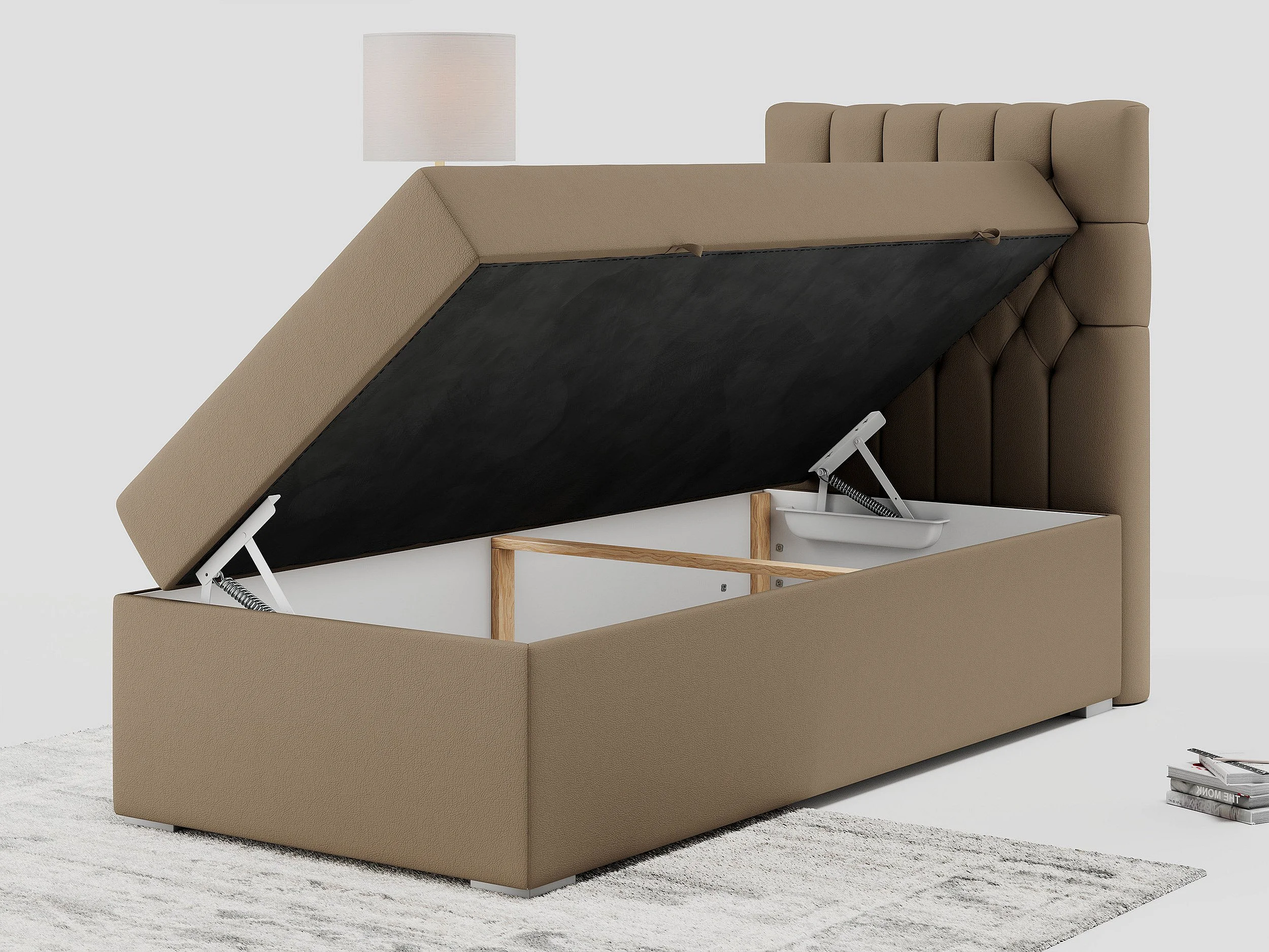 Boxspringbett PERA - Einzelbett mit Kopfstütze, Polsterbett, Multipocket-Matratze, genähtes Kopfteil - 90x200 cm - H3 - Braun Kunstleder - Rechts Seite