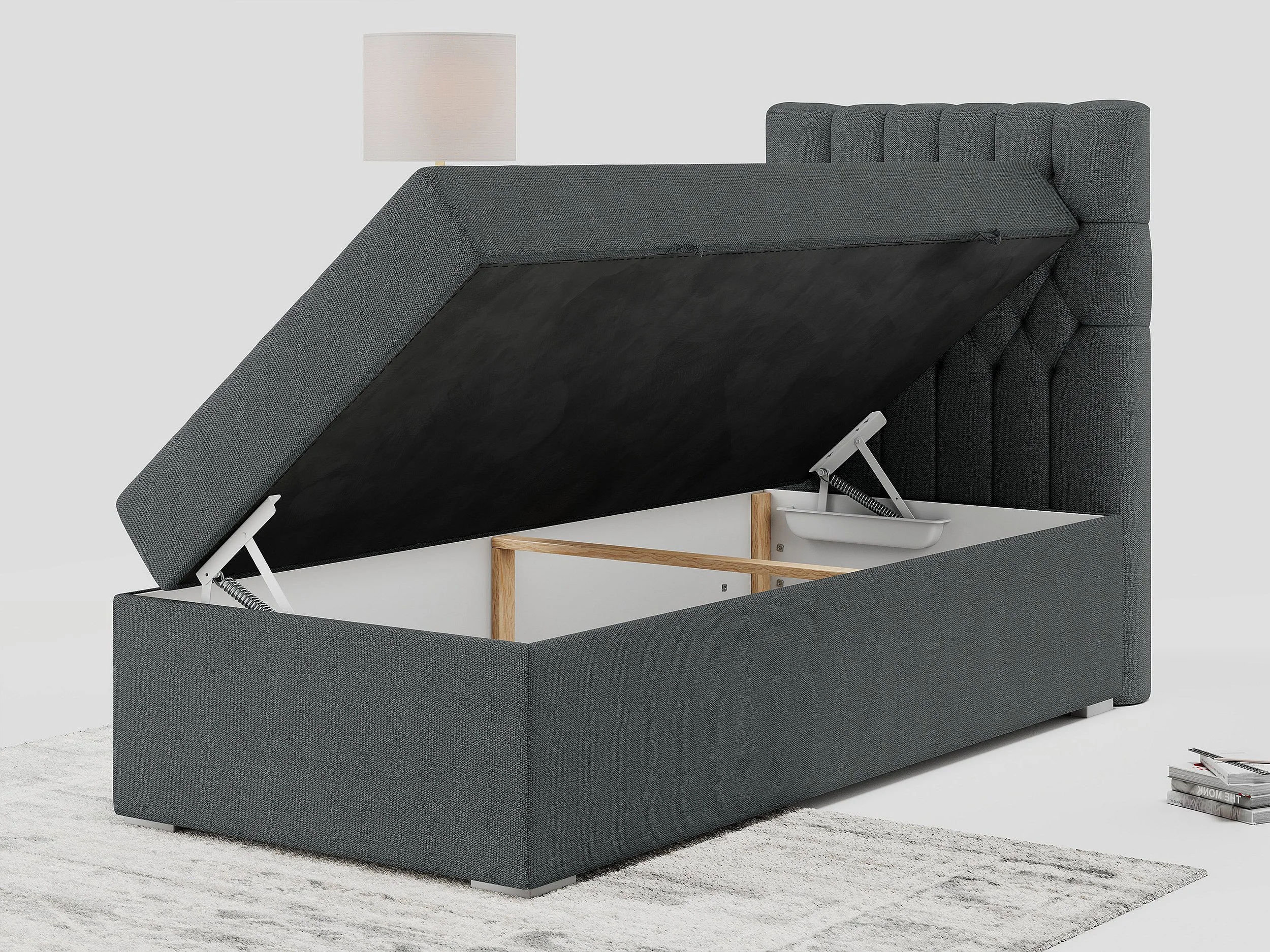 Boxspringbett PERA - Einzelbett mit Kopfstütze, Polsterbett, Multipocket-Matratze, genähtes Kopfteil - 90x200 cm - H3 - Dunkelgrau Strukture - Rechts Seite