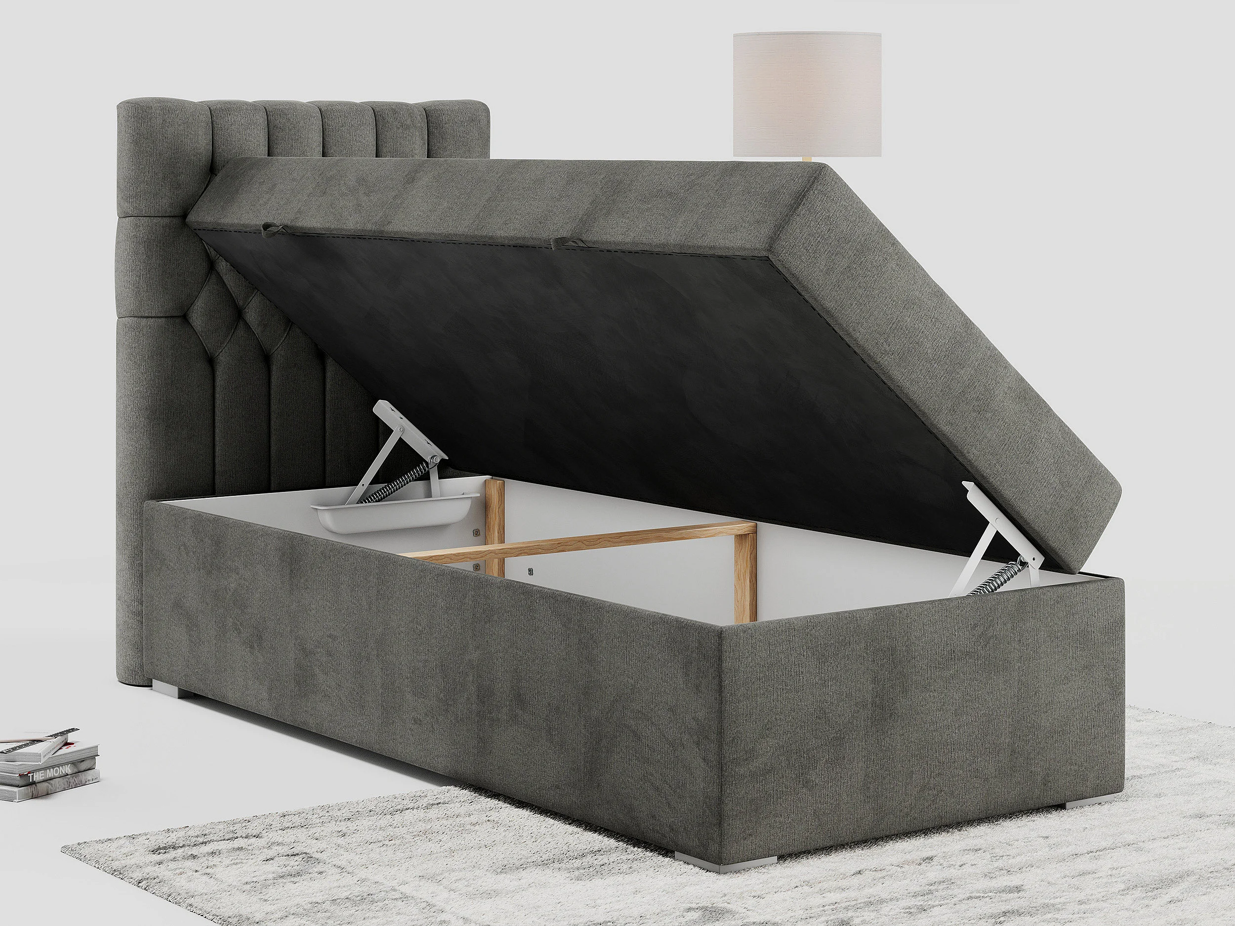 Boxspringbett PERA - Einzelbett mit Kopfstütze, Polsterbett, Multipocket-Matratze, genähtes Kopfteil - 90x200 cm - H3 - Dunkelgrau Velvet - Links Seite
