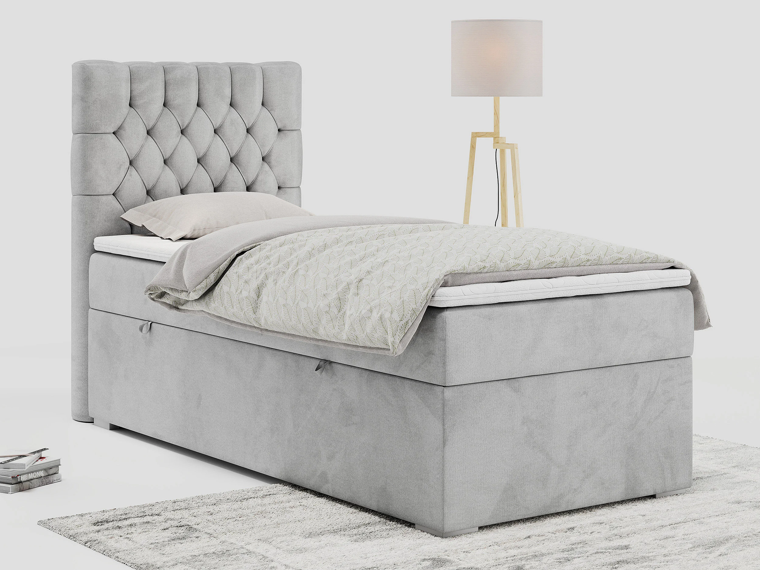 Boxspringbett PERA - Einzelbett mit Kopfstütze, Polsterbett, Multipocket-Matratze, genähtes Kopfteil - 90x200 cm - H3 - Hellgrau Velvet - Links Seite