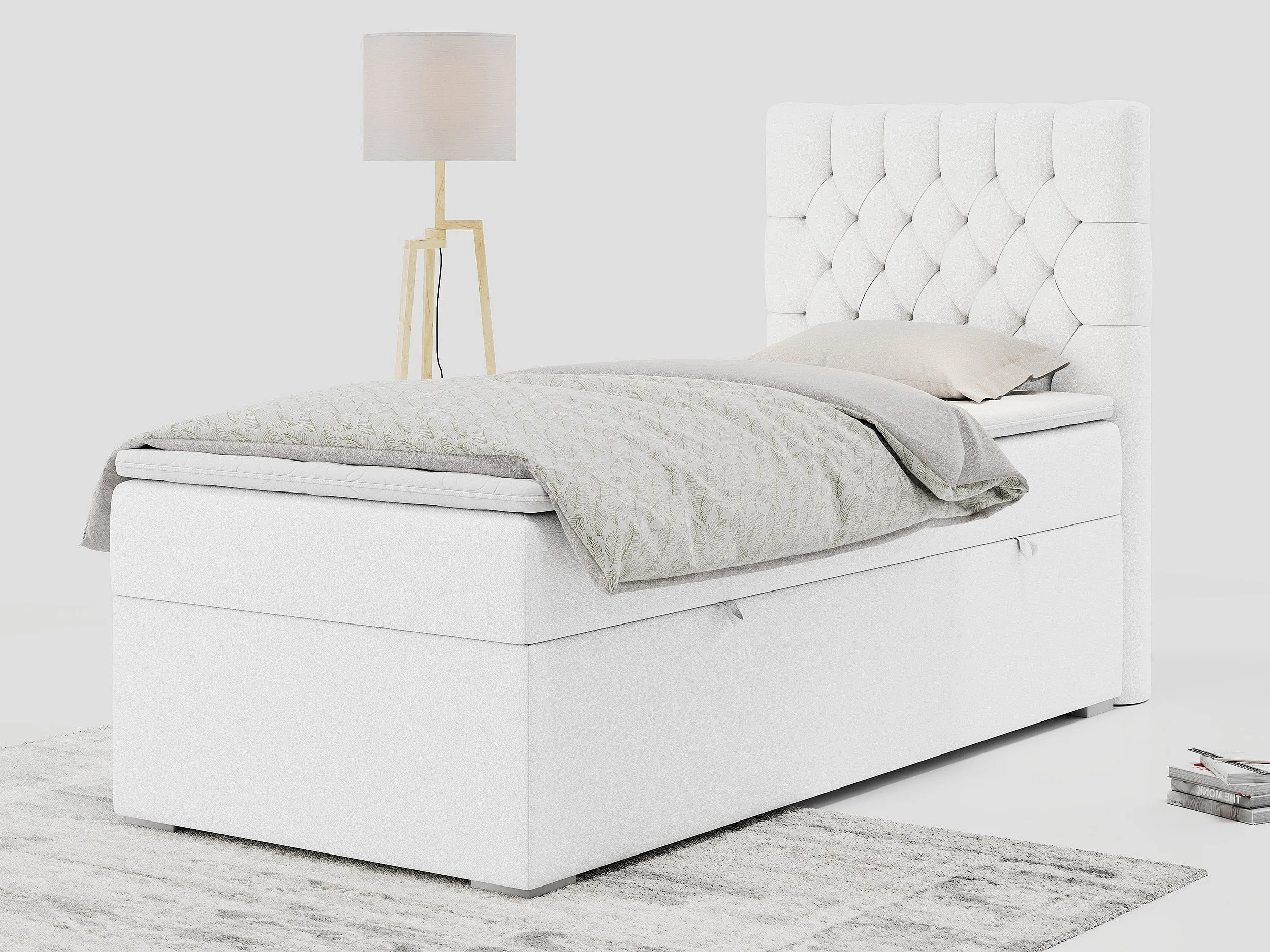 Boxspringbett PERA - Einzelbett mit Kopfstütze, Polsterbett, Multipocket-Matratze, genähtes Kopfteil - 90x200 cm - H3 - Weiß Kunstleder - Rechts Seite