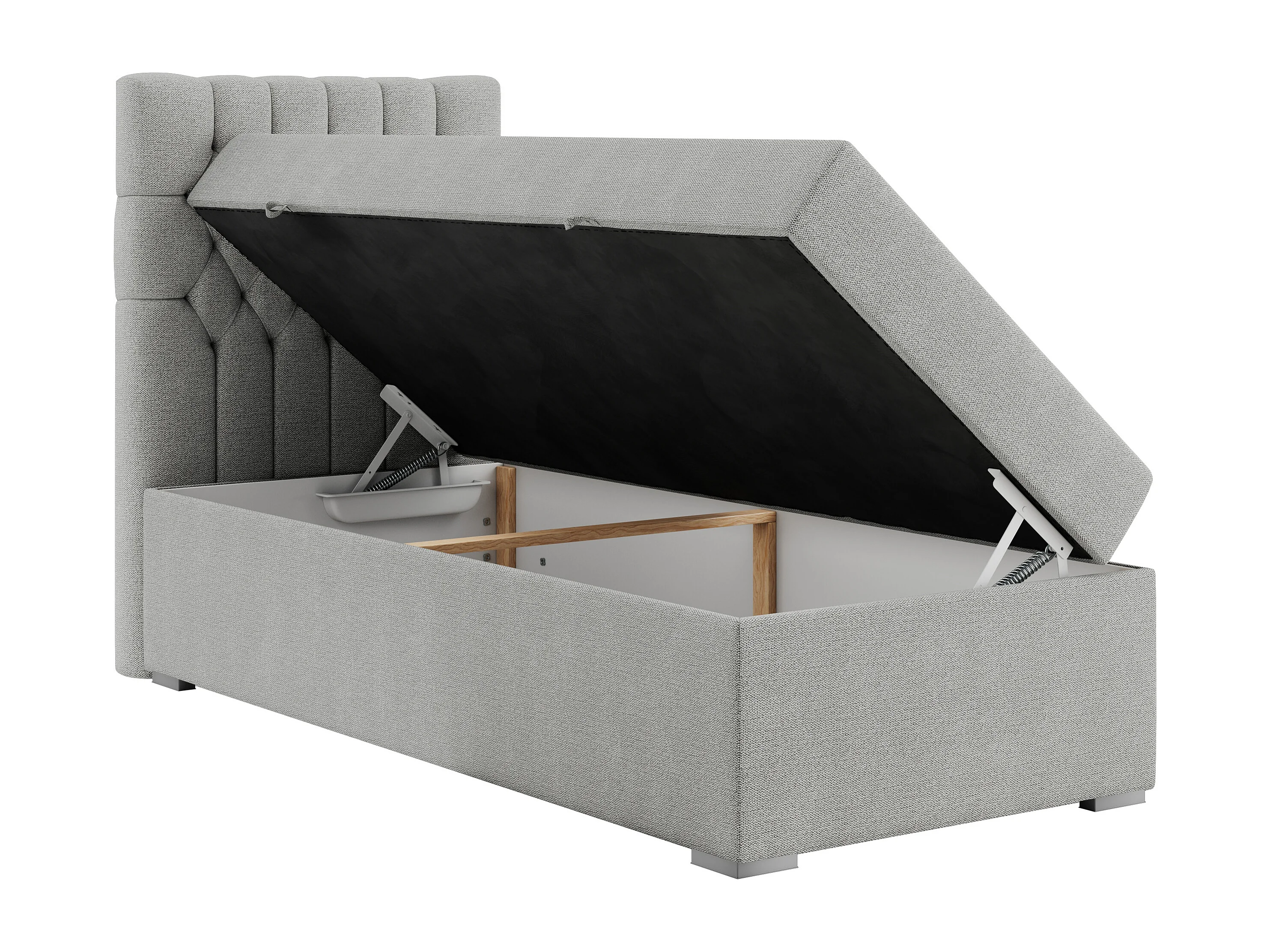 Boxspringbett PERA - Einzelbett mit Kopfstütze, Polsterbett, Multipocket-Matratze, genähtes Kopfteil - 90x200 cm - H4 - Hellgrau Strukture - Links Seite