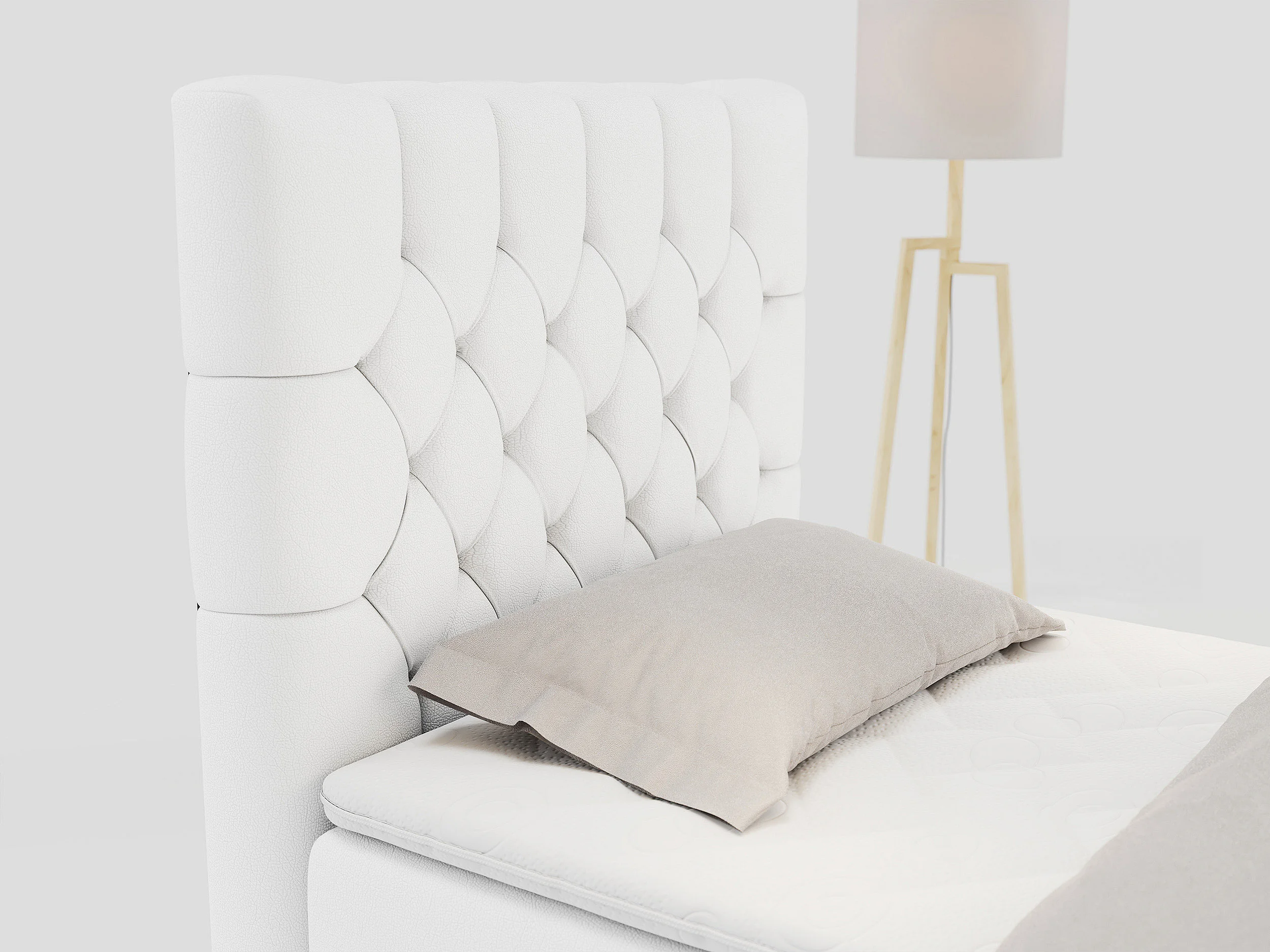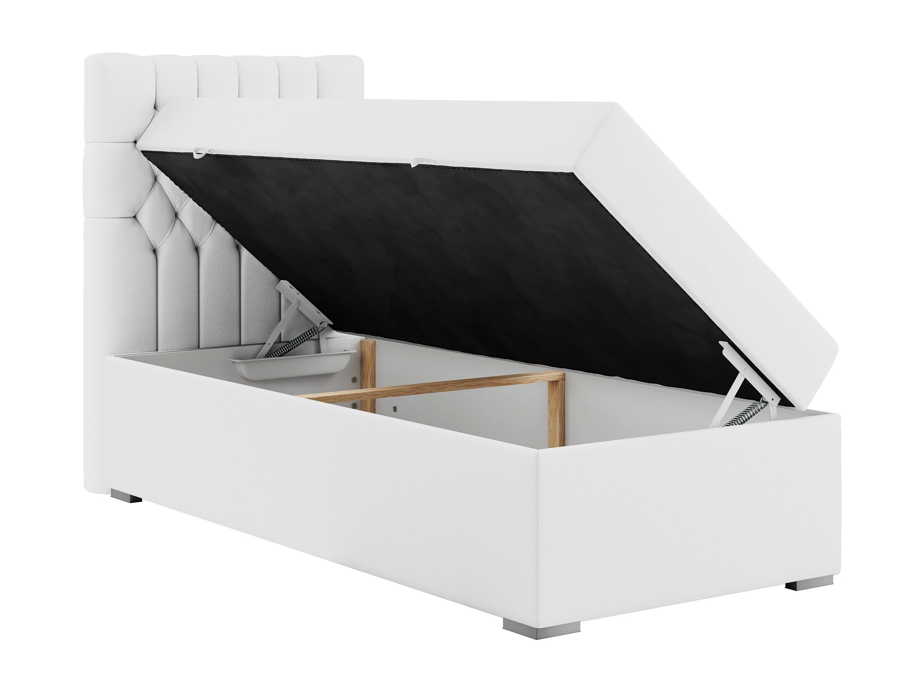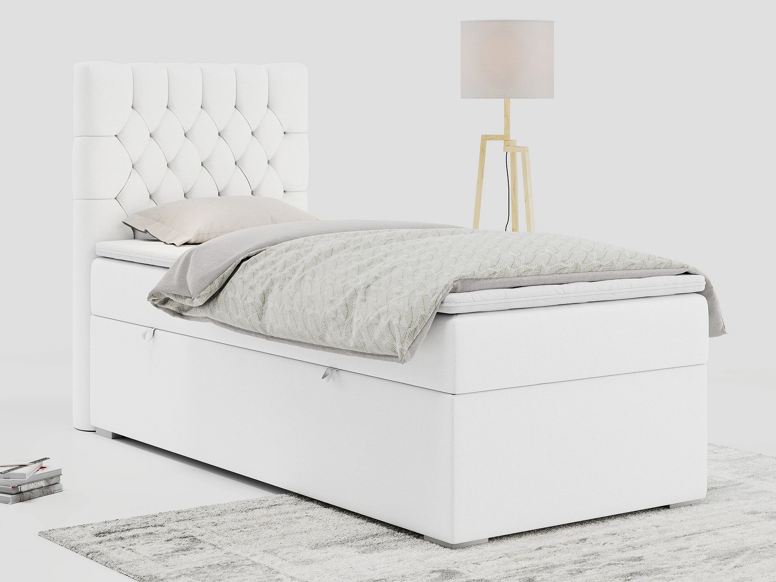 Boxspringbett PERA - Einzelbett mit Kopfstütze, Polsterbett, Multipocket-Matratze, genähtes Kopfteil - 90x200 cm - H4 - Weiß Kunstleder - Links Seite