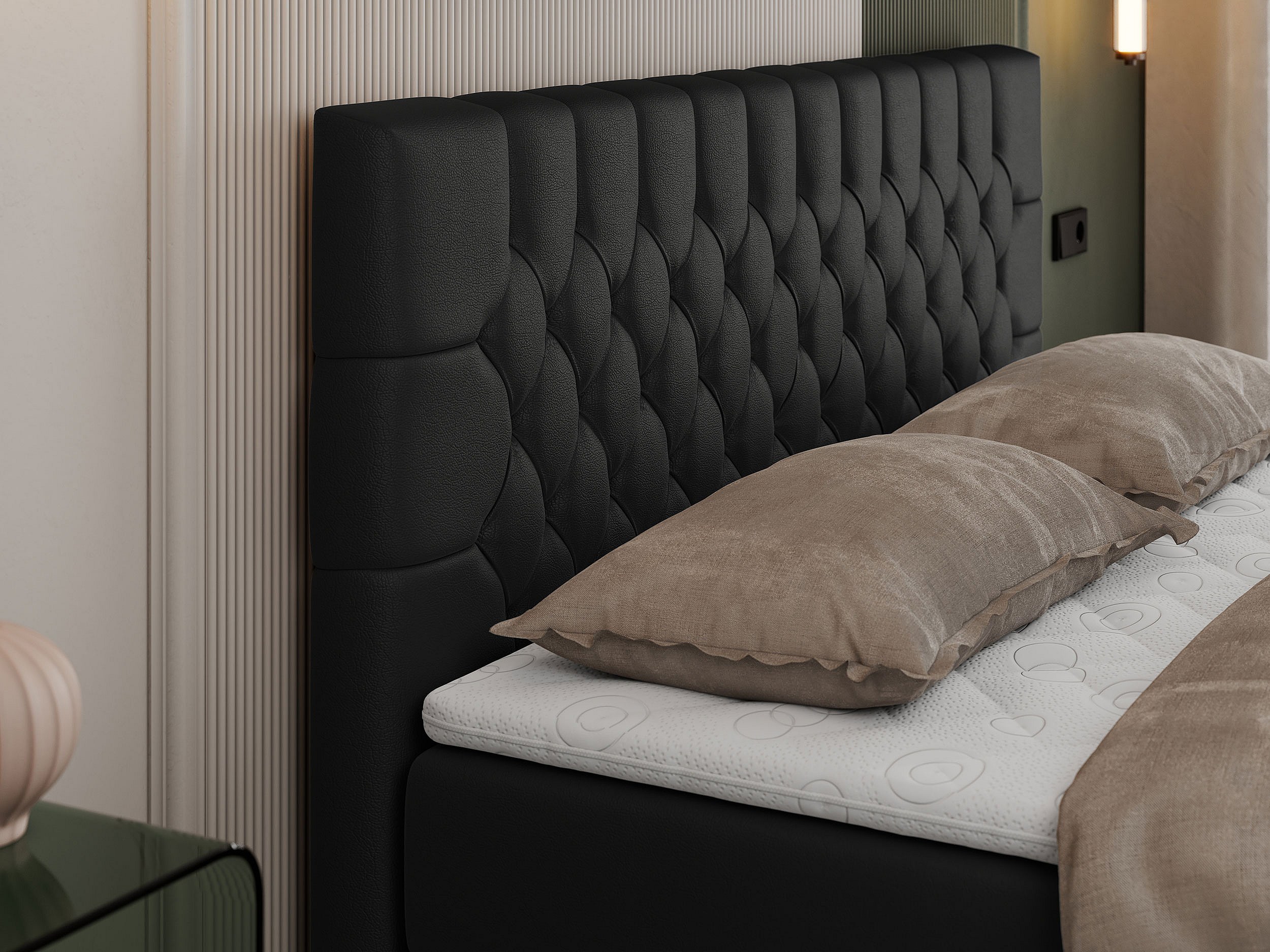 Boxspringbett PERA - gesteppte Kopfstütze, Multipocket-Matratze und Topper, Doppelbett mit Stauraum - 160x200 cm - H3 - Schwarz Kunstleder