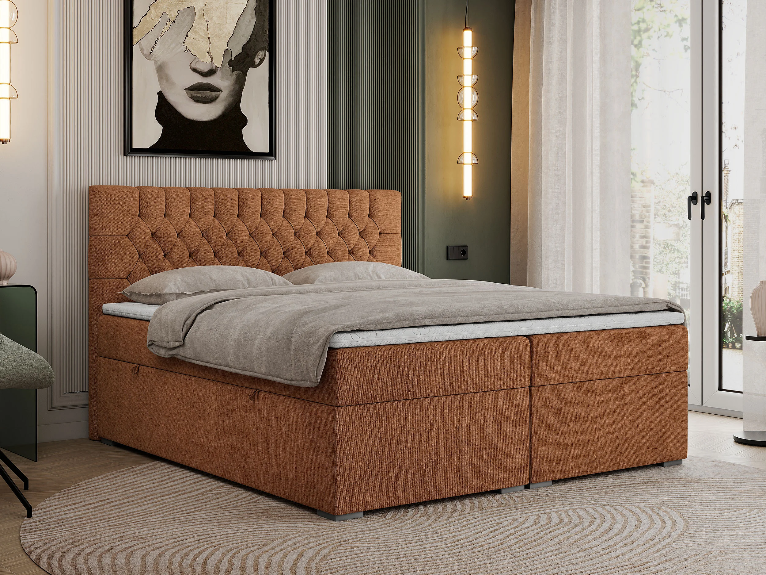 Boxspringbett PERA - gesteppte Kopfstütze, Multipocket-Matratze und Topper, Doppelbett mit Stauraum - 180x200 cm - H4 - Orange Strukture