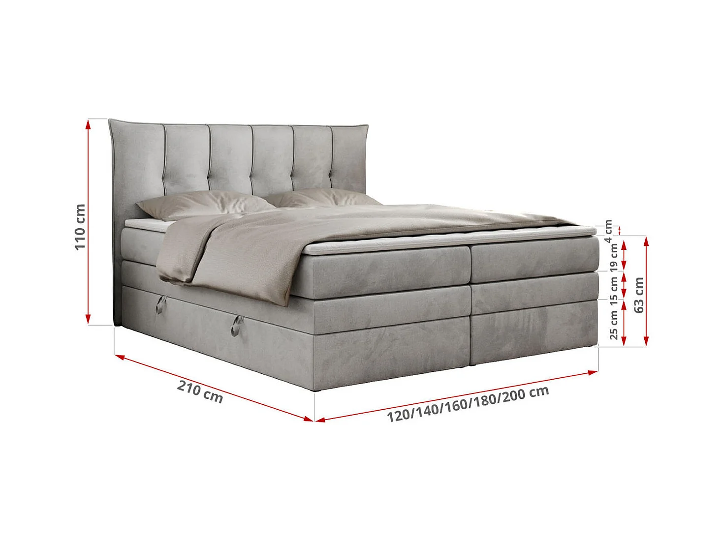 Boxspringbett PREMIUM 10 KING, Doppelbett mit Stauraum, gesteppte Kopfstütze, Multipocket-Matratze - 140x200 cm - H3 - Hellgrau Velvet