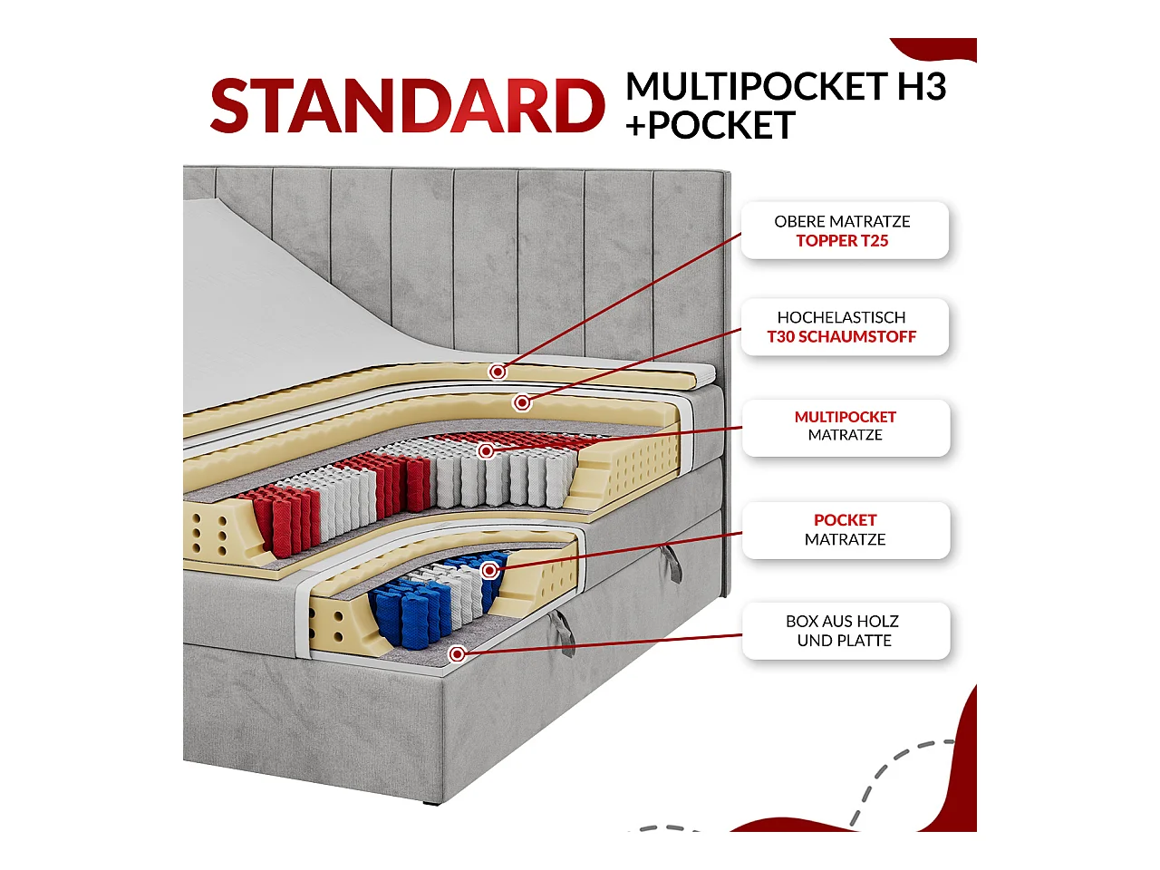 Boxspringbett PREMIUM 10 KING, Doppelbett mit Stauraum, gesteppte Kopfstütze, Multipocket-Matratze - 160x200 cm - H3 - Orange Strukture