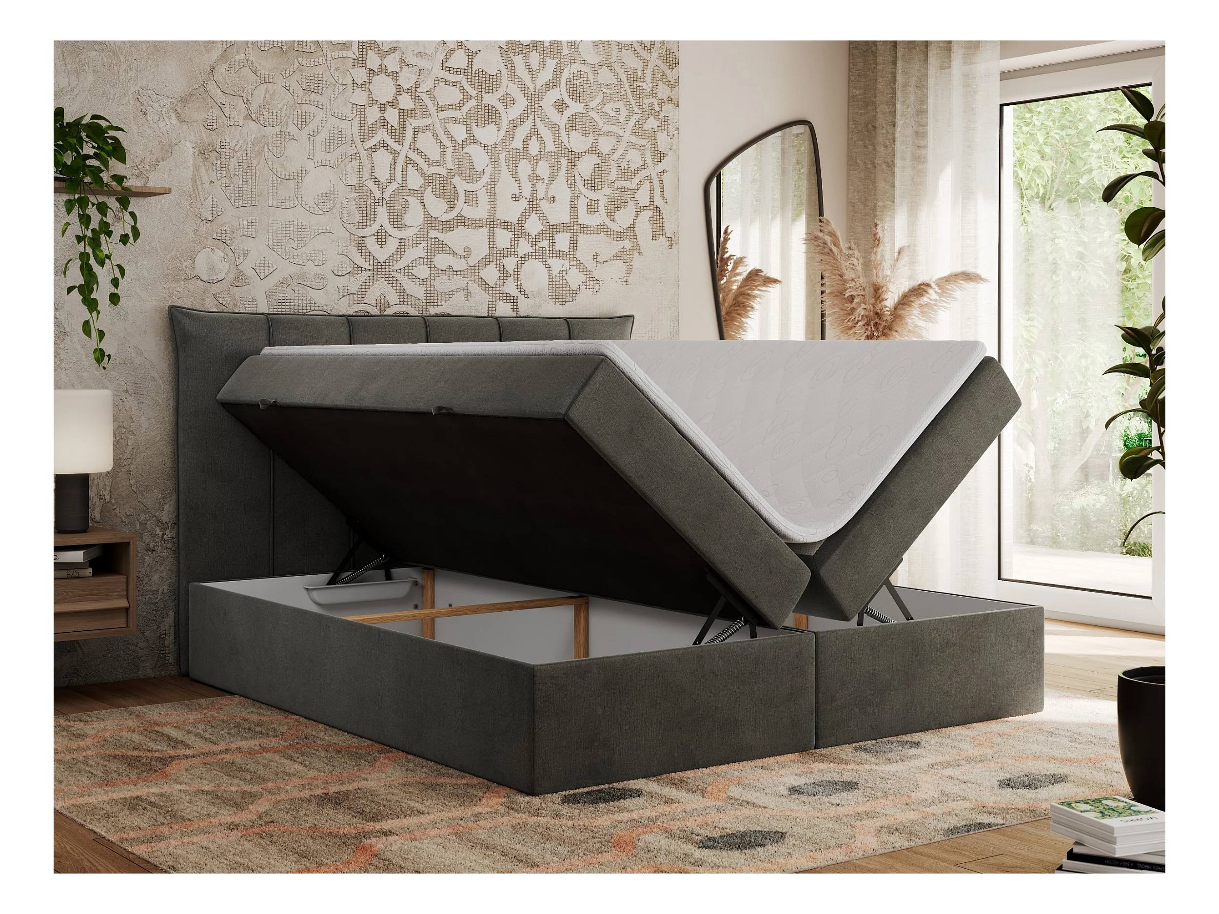 Boxspringbett PREMIUM 10 mit Multipocket-Matratze, gesteppte Kopfstütze, zwei Bettkästen - 200x200 cm - H3 - Dunkelgrau Velvet