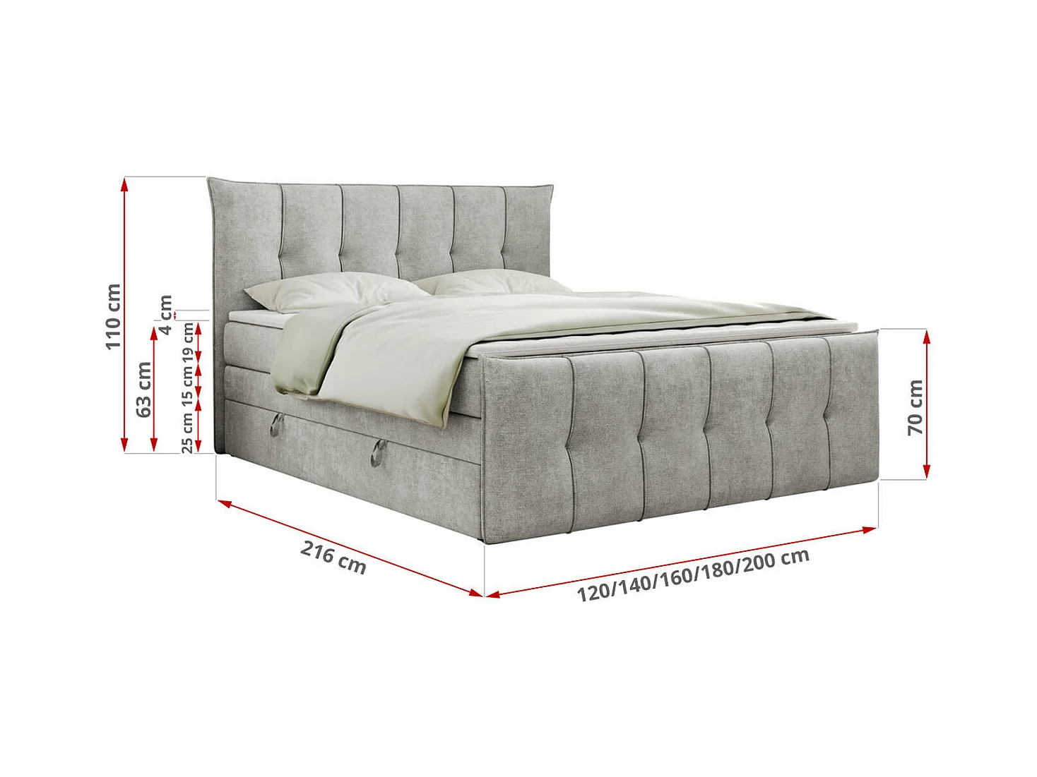 Boxspringbett PREMIUM 11 KING mit Stauraum, gestepptes Kopfteil, zwei Multipocket-Matratzen - 120x200 cm - H4 - Hellgrau Strukture