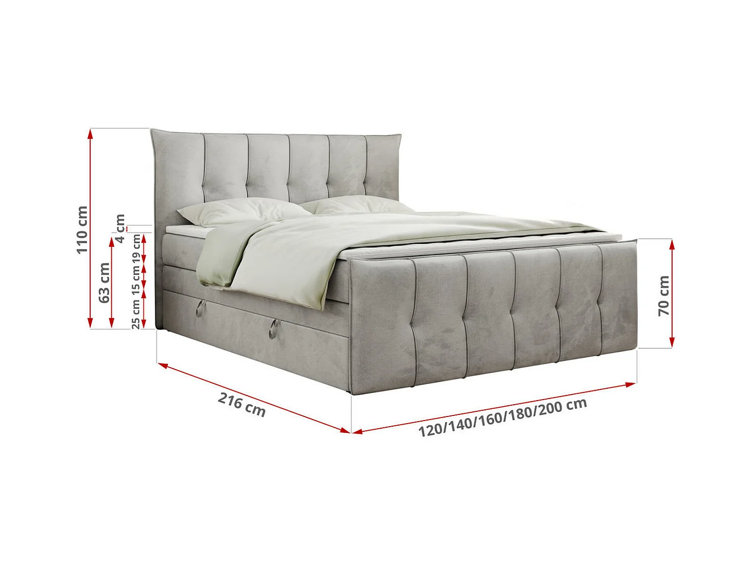 Boxspringbett PREMIUM 11 KING mit Stauraum, gestepptes Kopfteil, zwei Multipocket-Matratzen - 120x200 cm - H4 - Hellgrau Velvet