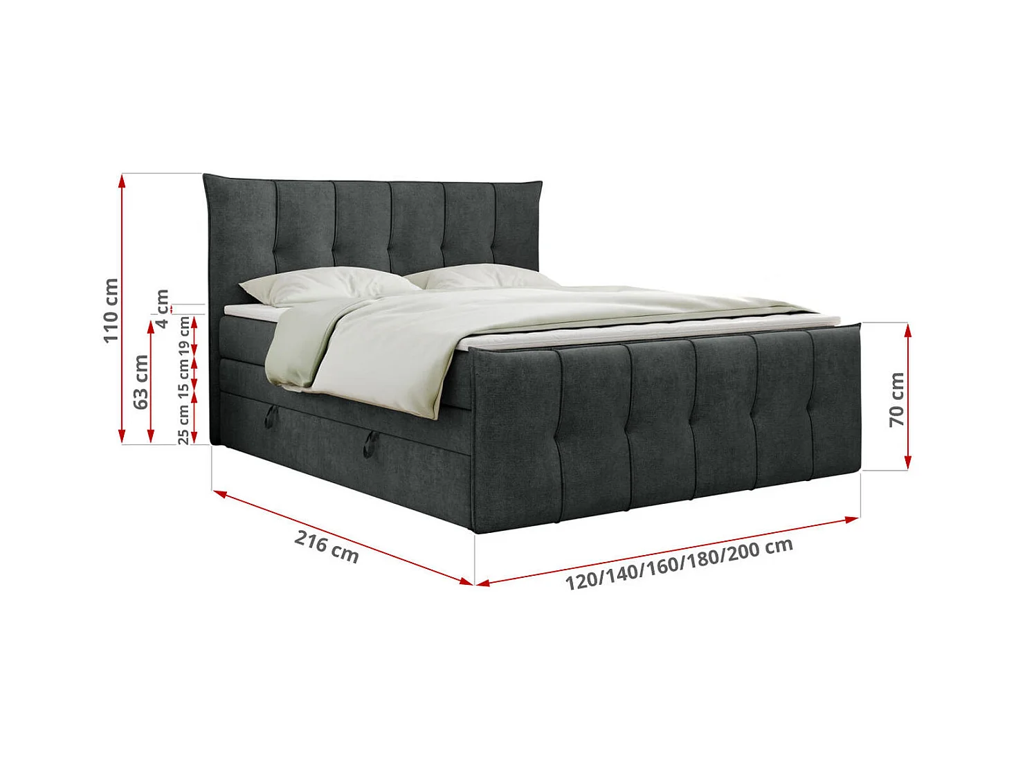 Boxspringbett PREMIUM 11 KING mit Stauraum, gestepptes Kopfteil, zwei Multipocket-Matratzen - 140x200 cm - H3 - Dunkelgrau Strukture