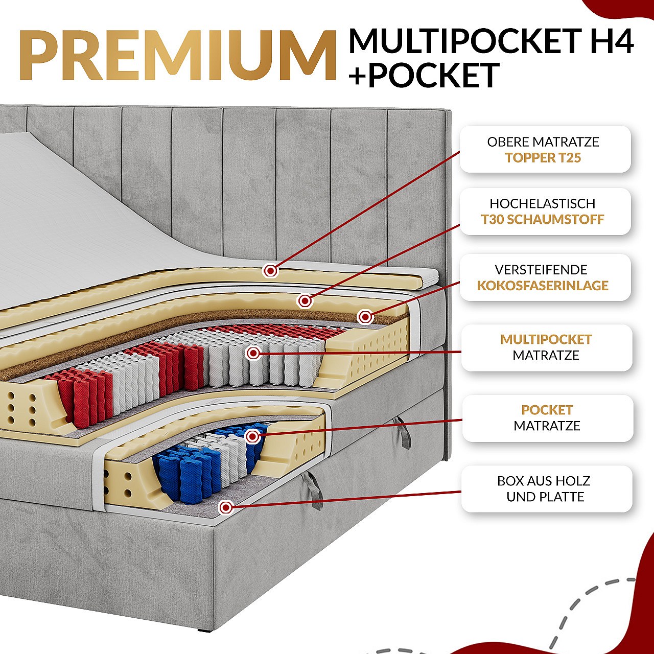 Boxspringbett PREMIUM 11 KING mit Stauraum, gestepptes Kopfteil, zwei Multipocket-Matratzen - 180x200 cm - H4 - Hellgrau Velvet