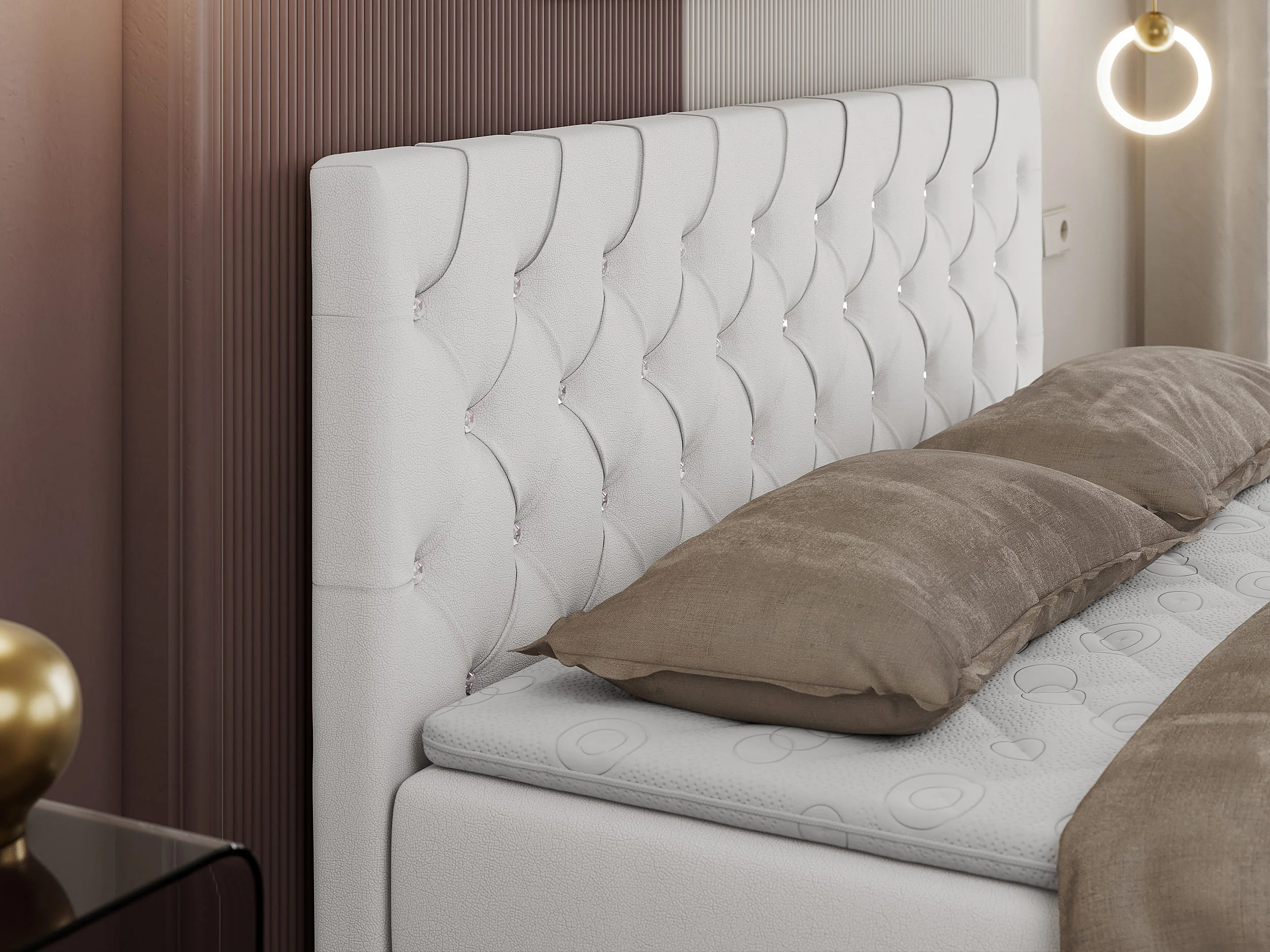 Boxspringbett ROMA mit gestepptem Kopfteil, Multipocket-Matratze, dekorative Füße - 140x200 cm - H4 - Weiß Kunstleder