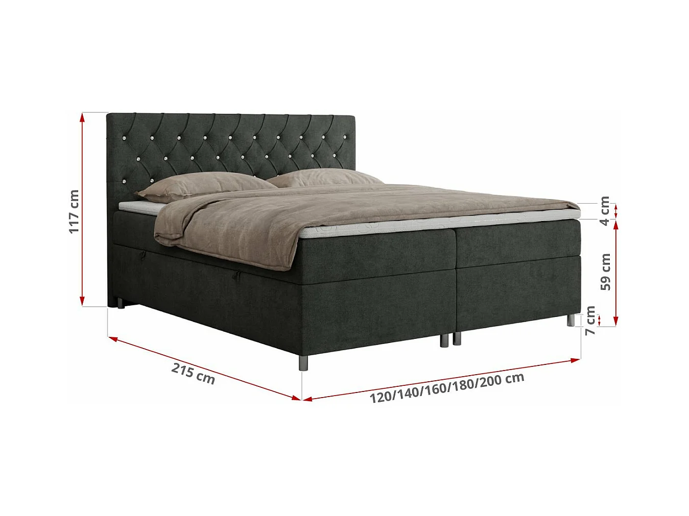 Boxspringbett ROMA mit gestepptem Kopfteil, Multipocket-Matratze, dekorative Füße - 160x200 cm - H3 - Hellgrau Strukture