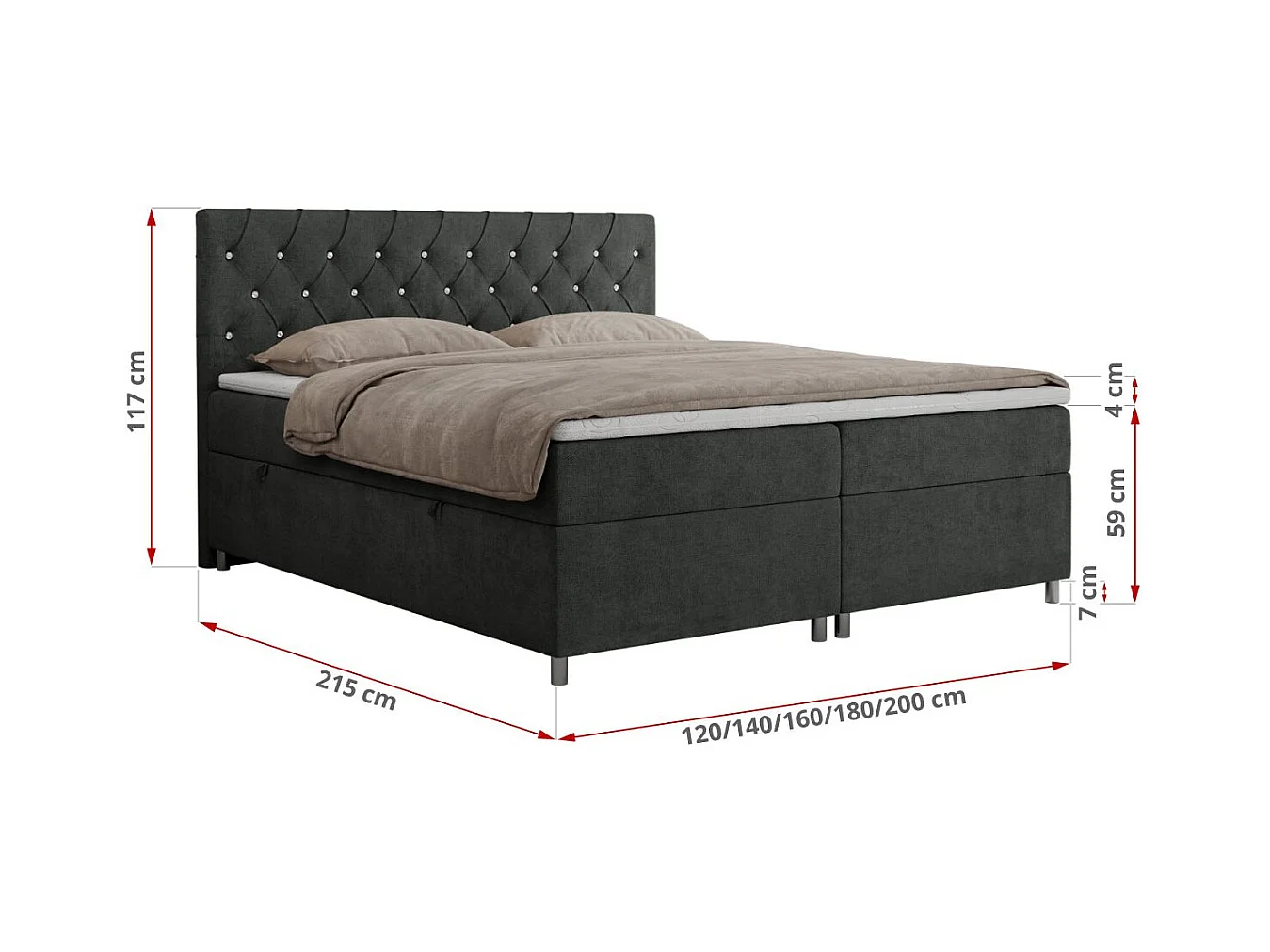 Boxspringbett ROMA mit gestepptem Kopfteil, Multipocket-Matratze, dekorative Füße - 160x200 cm - H4 - Hellgrau Strukture