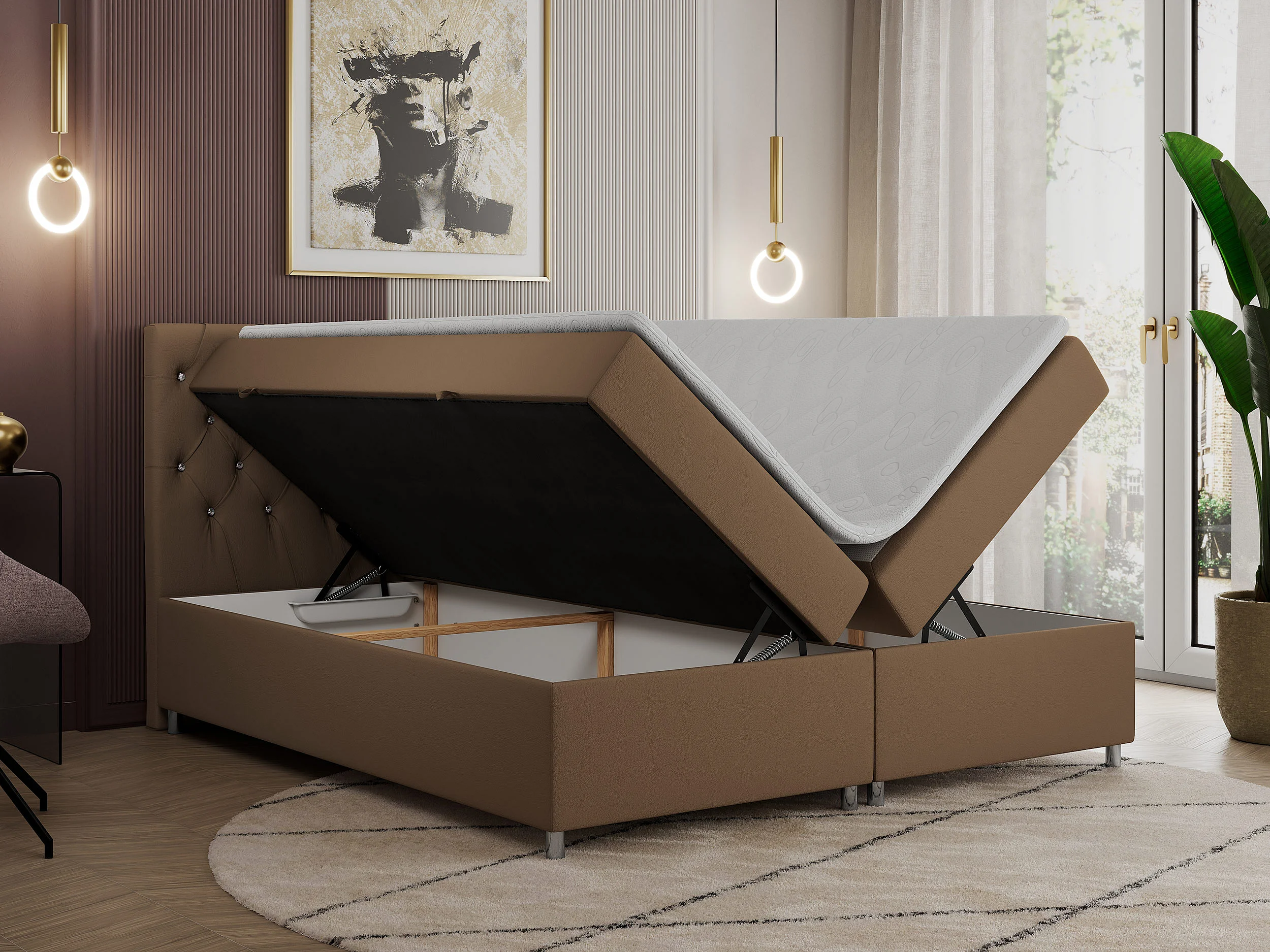 Boxspringbett ROMA mit gestepptem Kopfteil, Multipocket-Matratze, dekorative Füße - 200x200 cm - H3 - Braun Kunstleder