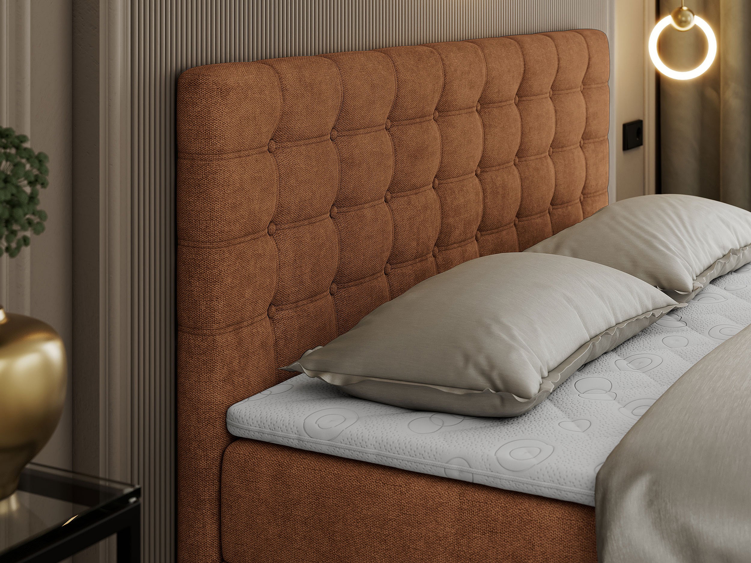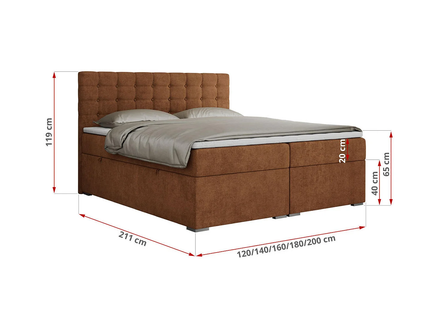 Boxspringbett SUSAN - mit gestepptem Kopfteil, zwei Bettkästen und Topper, gepolstertes Schlafzimmerbett - 120x200 cm - H3 - Orange Stukture