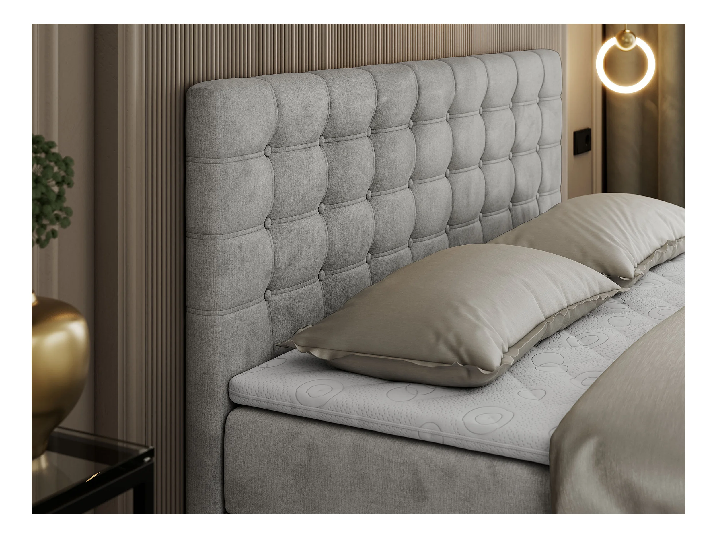 Boxspringbett SUSAN - mit gestepptem Kopfteil, zwei Bettkästen und Topper, gepolstertes Schlafzimmerbett - 160x200 cm - H3 - Hellgrau Velvet