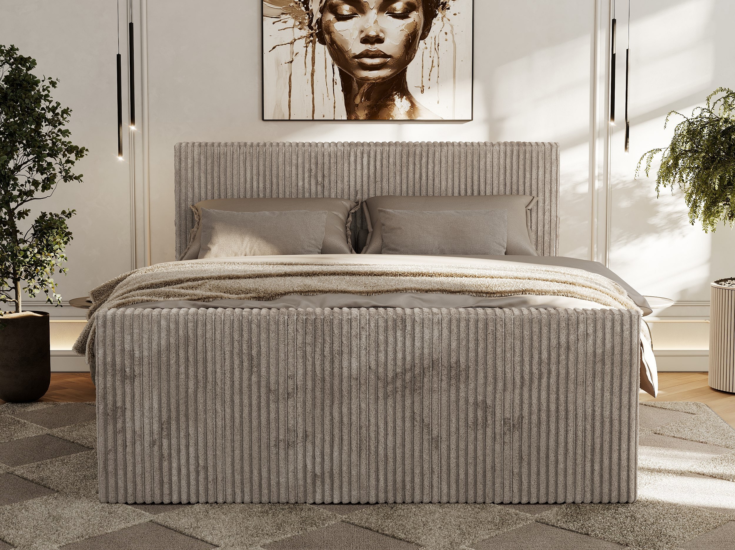 Boxspringbett TILIANO DUO mit gepolstertem Fußteil, Cord Bett, Multipocket-Matratze - 200x200 cm - H4 - Hellbraun Cord