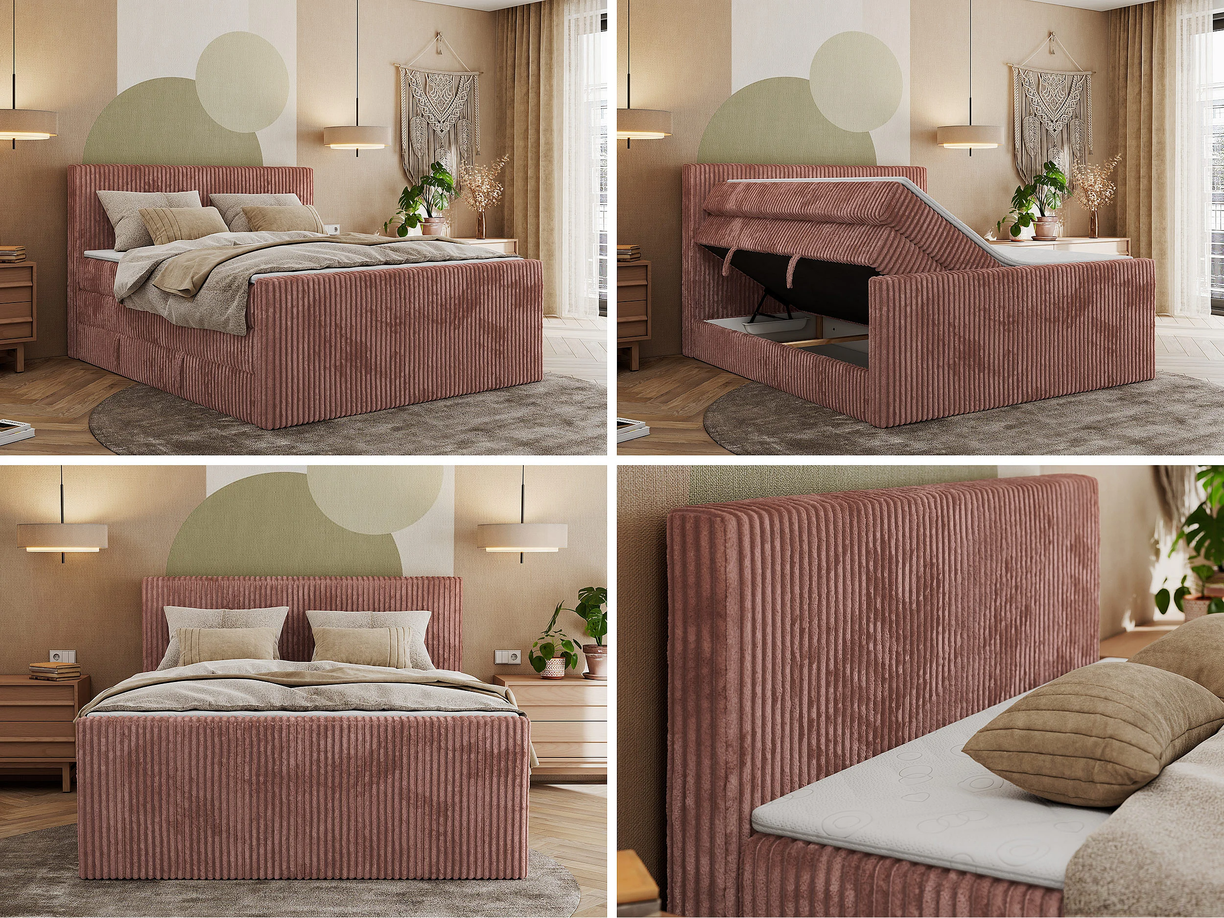 Boxspringbett TILIANO KING DUO, mit zwei Bettkästen, Cord Bett Multipocket-Matratze - 200x200 cm - H3 - Rosa Cord