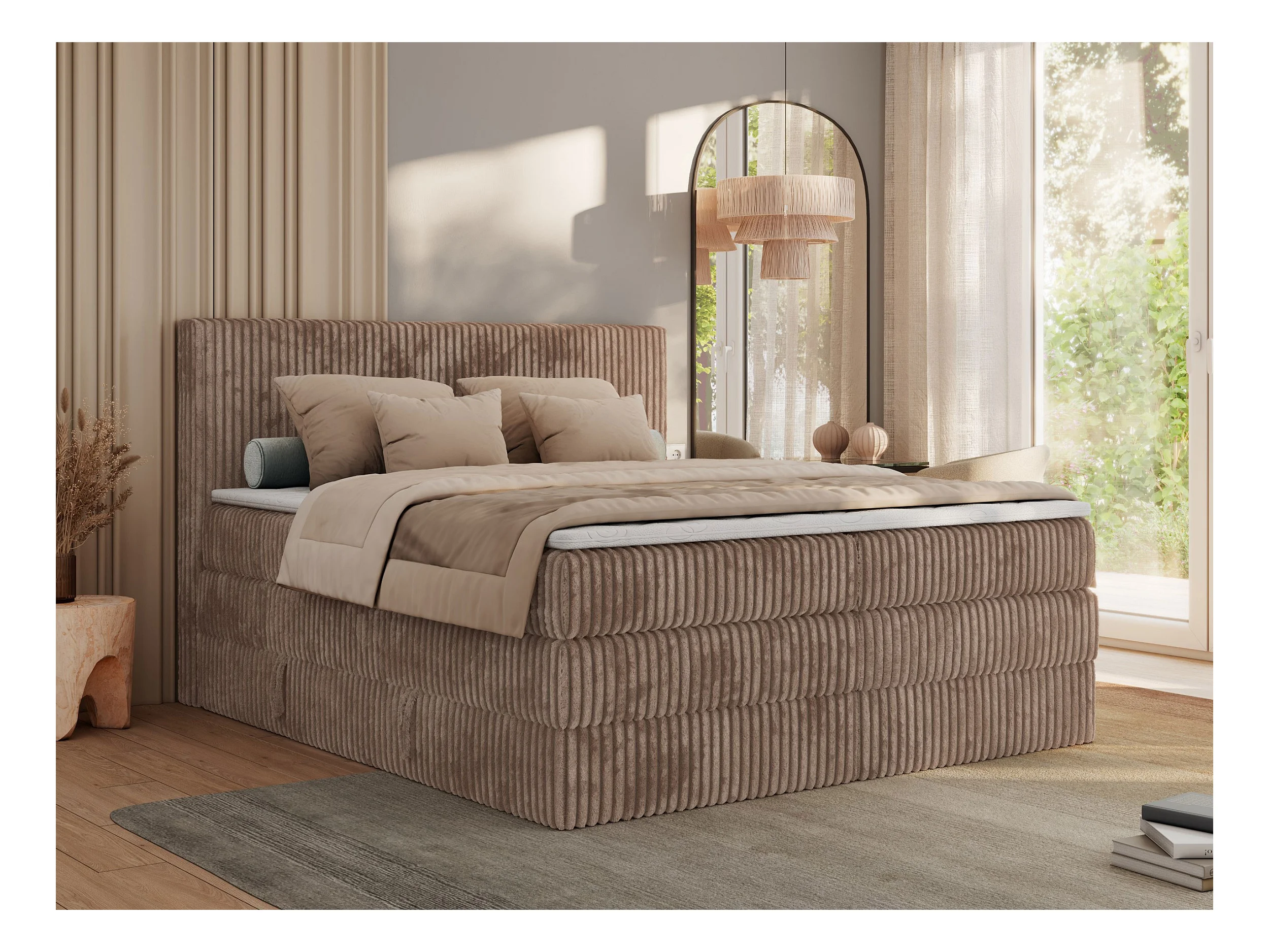 Boxspringbett TILIANO KING, Multipocket-Matratze, Cord Bett, Kopfteil und zwei Bettkästen - 140x200 cm - H3 - Braun Cord