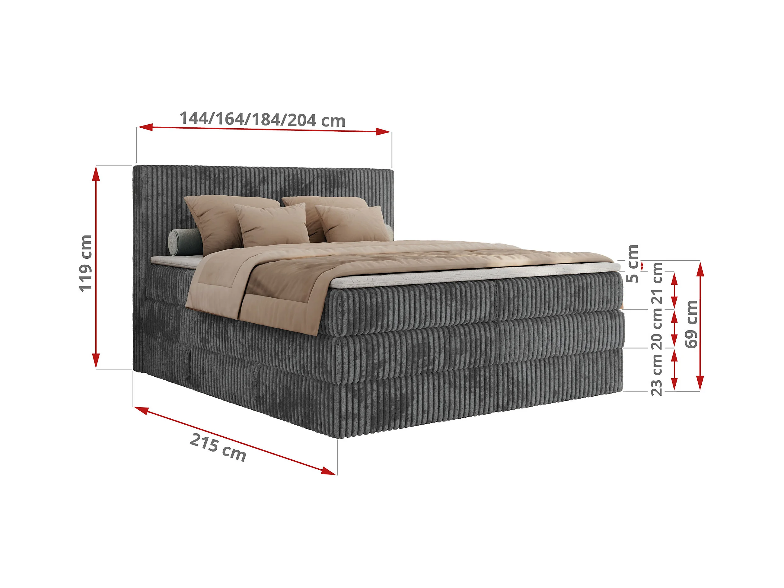 Boxspringbett TILIANO KING, Multipocket-Matratze, Cord Bett, Kopfteil und zwei Bettkästen - 140x200 cm - H3 - Grau Cord