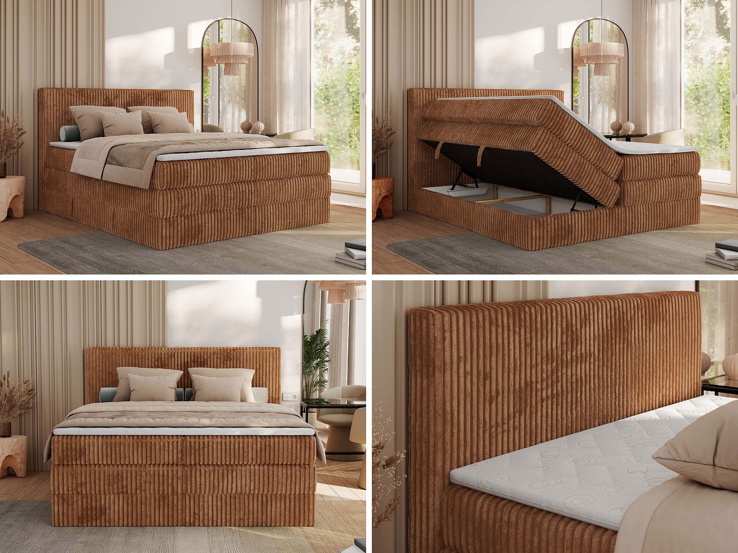 Boxspringbett TILIANO KING, Multipocket-Matratze, Cord Bett, Kopfteil und zwei Bettkästen - 140x200 cm - H4 - Orange Cord