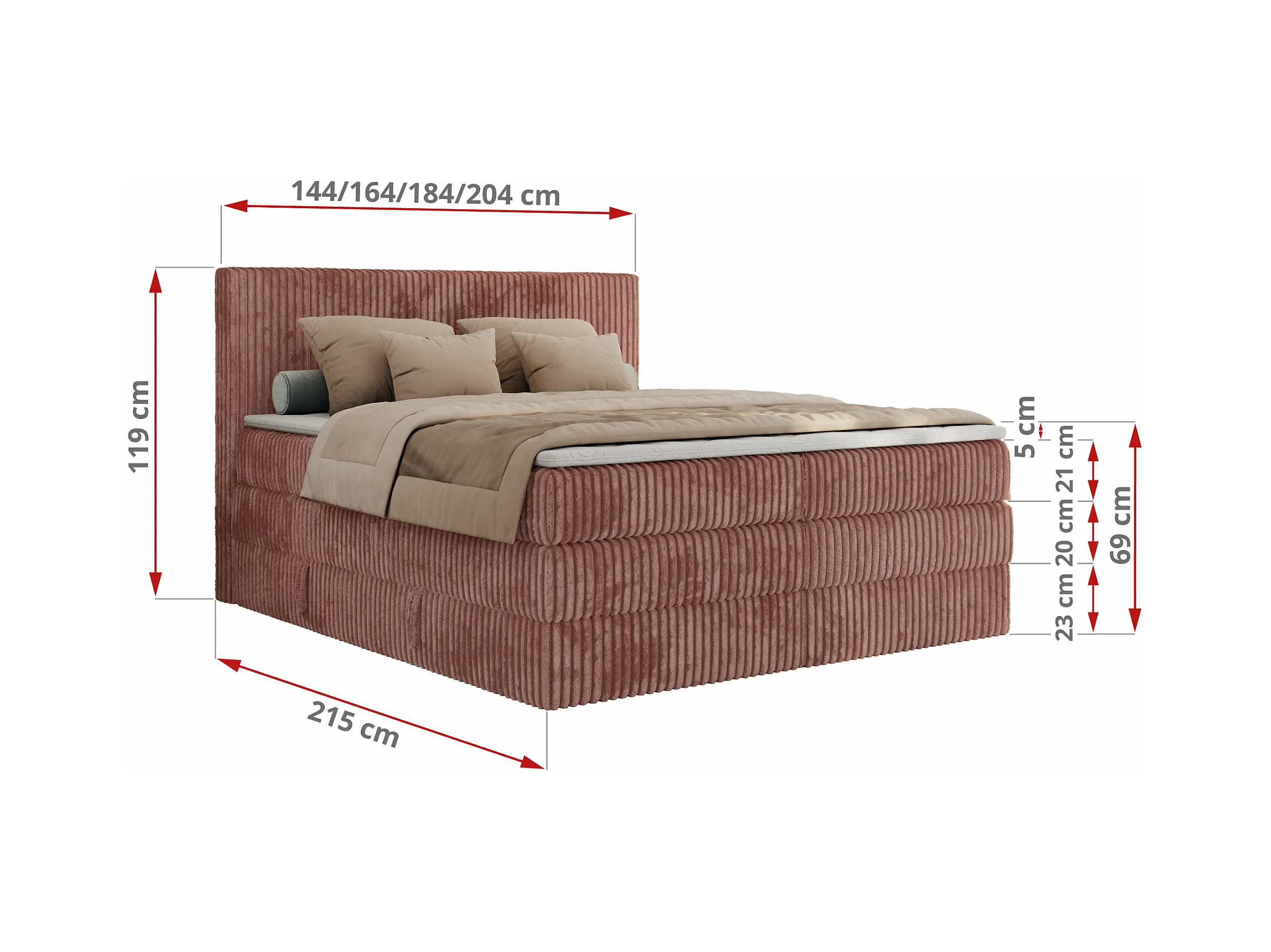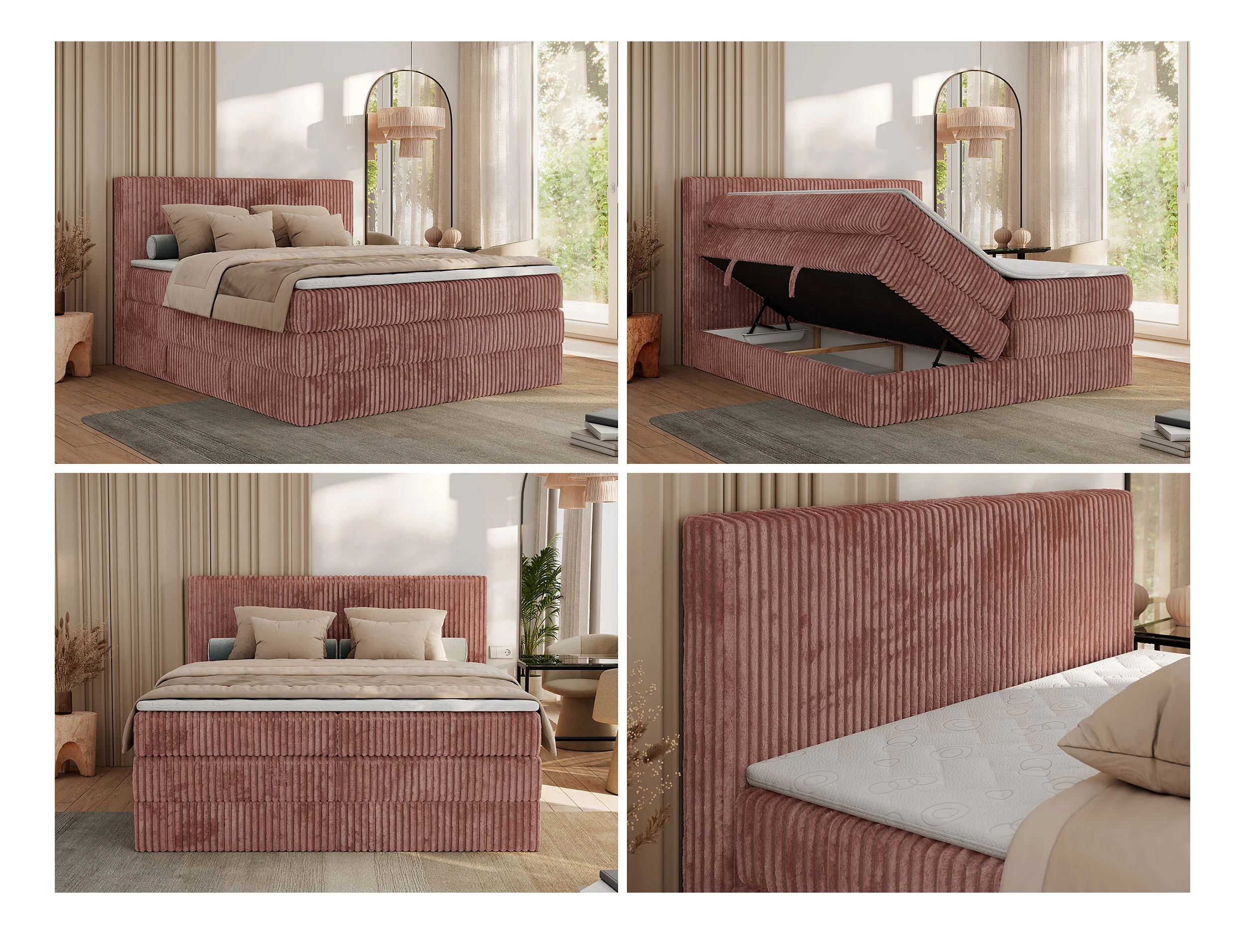 Boxspringbett TILIANO KING, Multipocket-Matratze, Cord Bett, Kopfteil und zwei Bettkästen - 140x200 cm - H4 - Rosa Cord