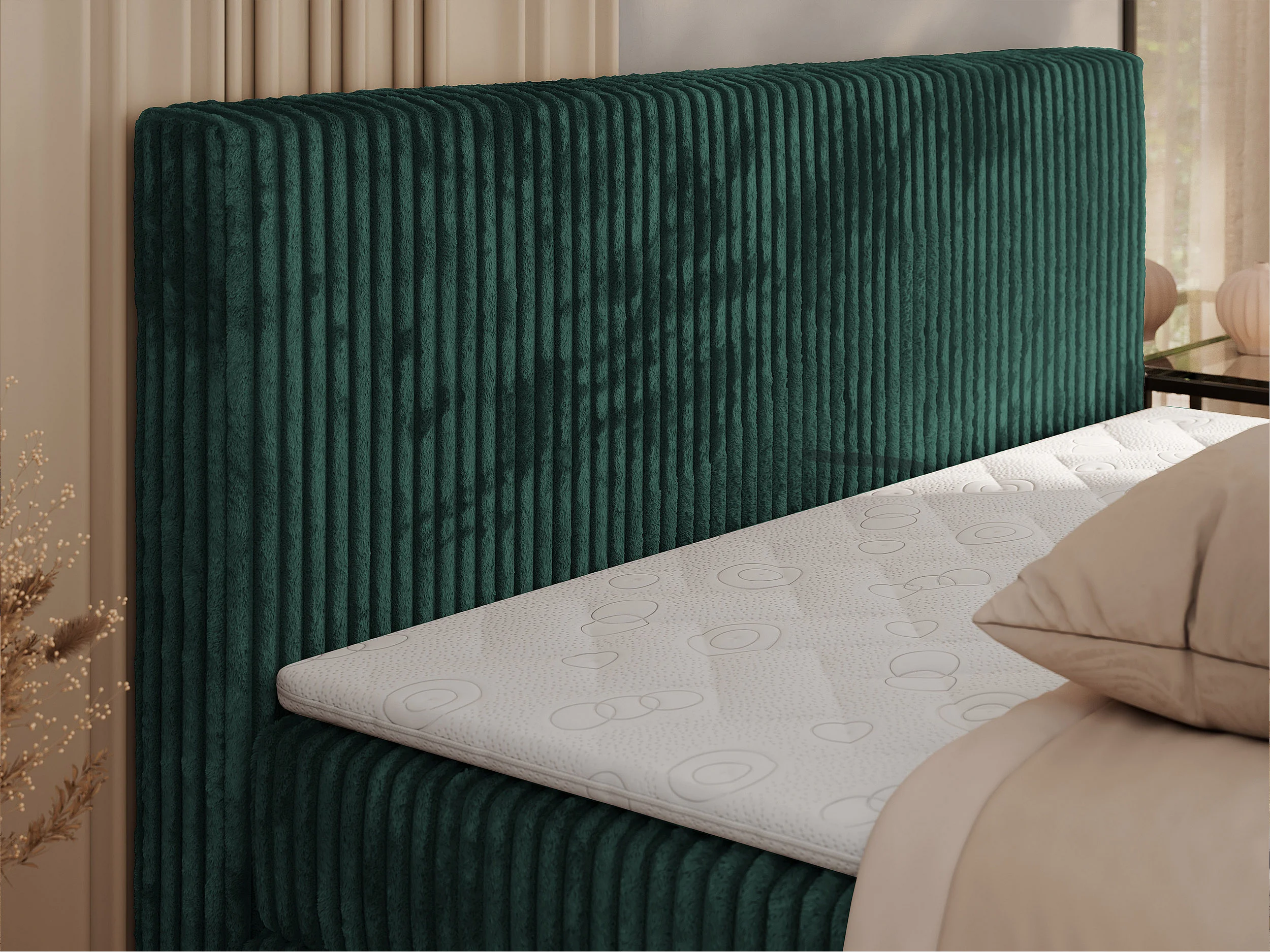 Boxspringbett TILIANO KING, Multipocket-Matratze, Cord Bett, Kopfteil und zwei Bettkästen - 160x200 cm - H3 - Dunkelgrün Cord