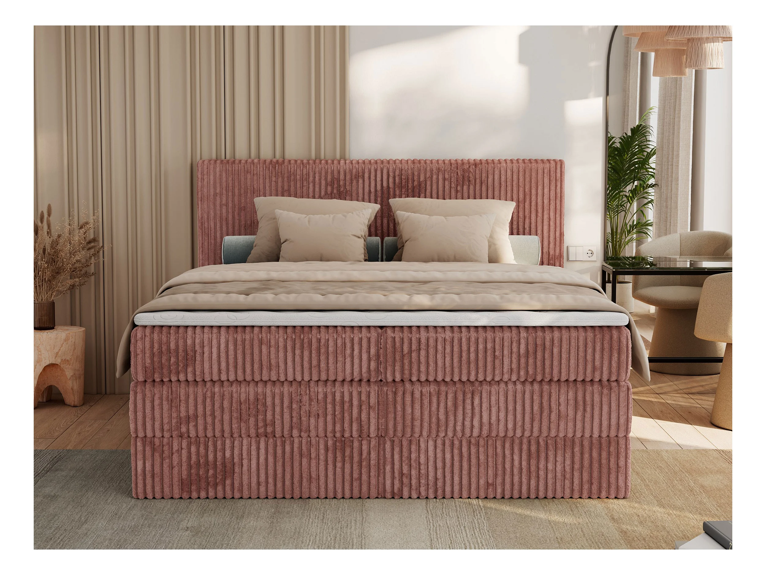 Boxspringbett TILIANO KING, Multipocket-Matratze, Cord Bett, Kopfteil und zwei Bettkästen - 180x200 cm - H4 - Rosa Cord
