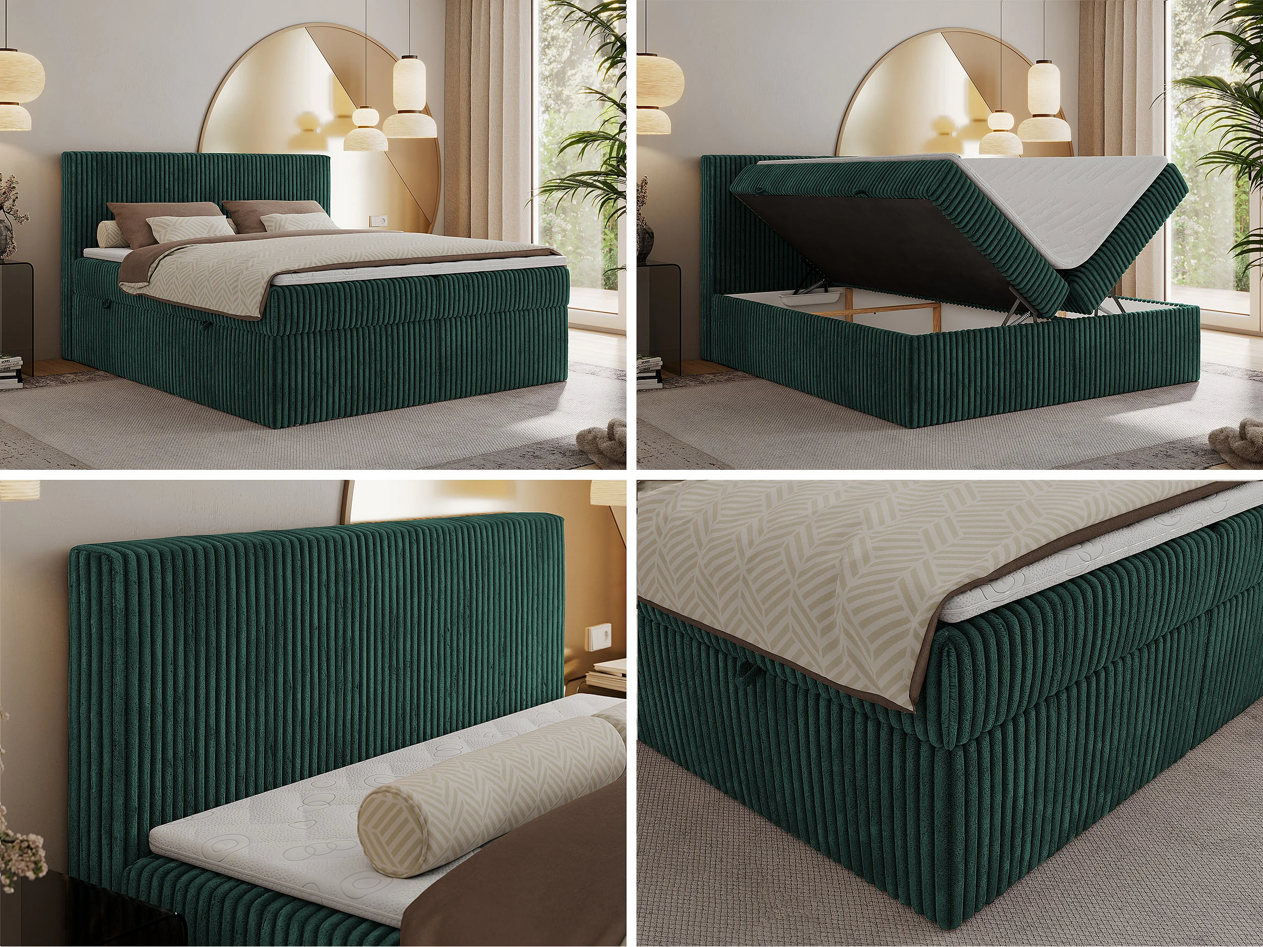 Boxspringbett TILIANO mit Kopfteil und zwei Bettkästen, Cord Bett - 140x200 cm - H4 - Dunkelgrün Cord