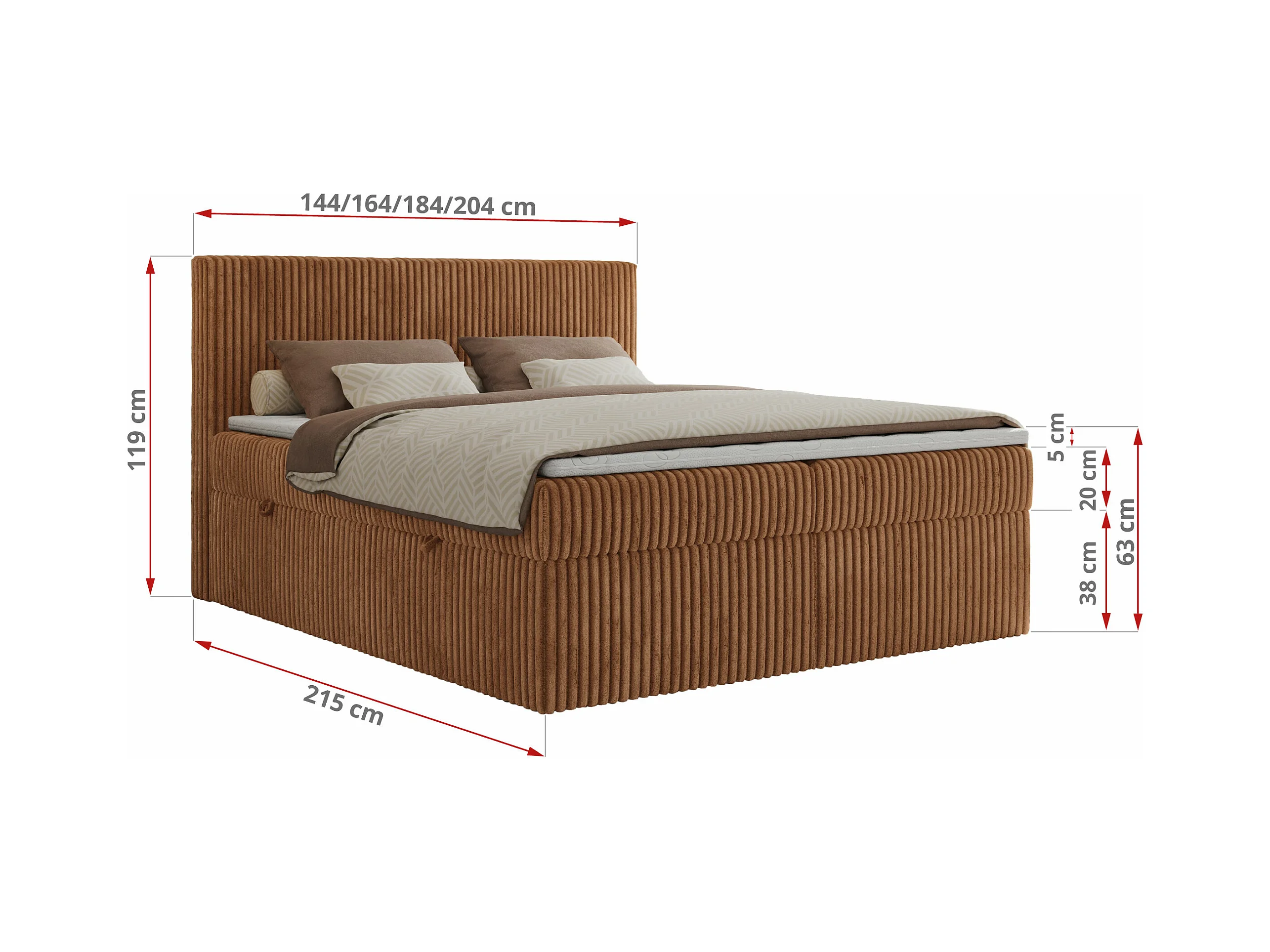 Boxspringbett TILIANO mit Kopfteil und zwei Bettkästen, Cord Bett - 200x200 cm - H4 - Orange Cord