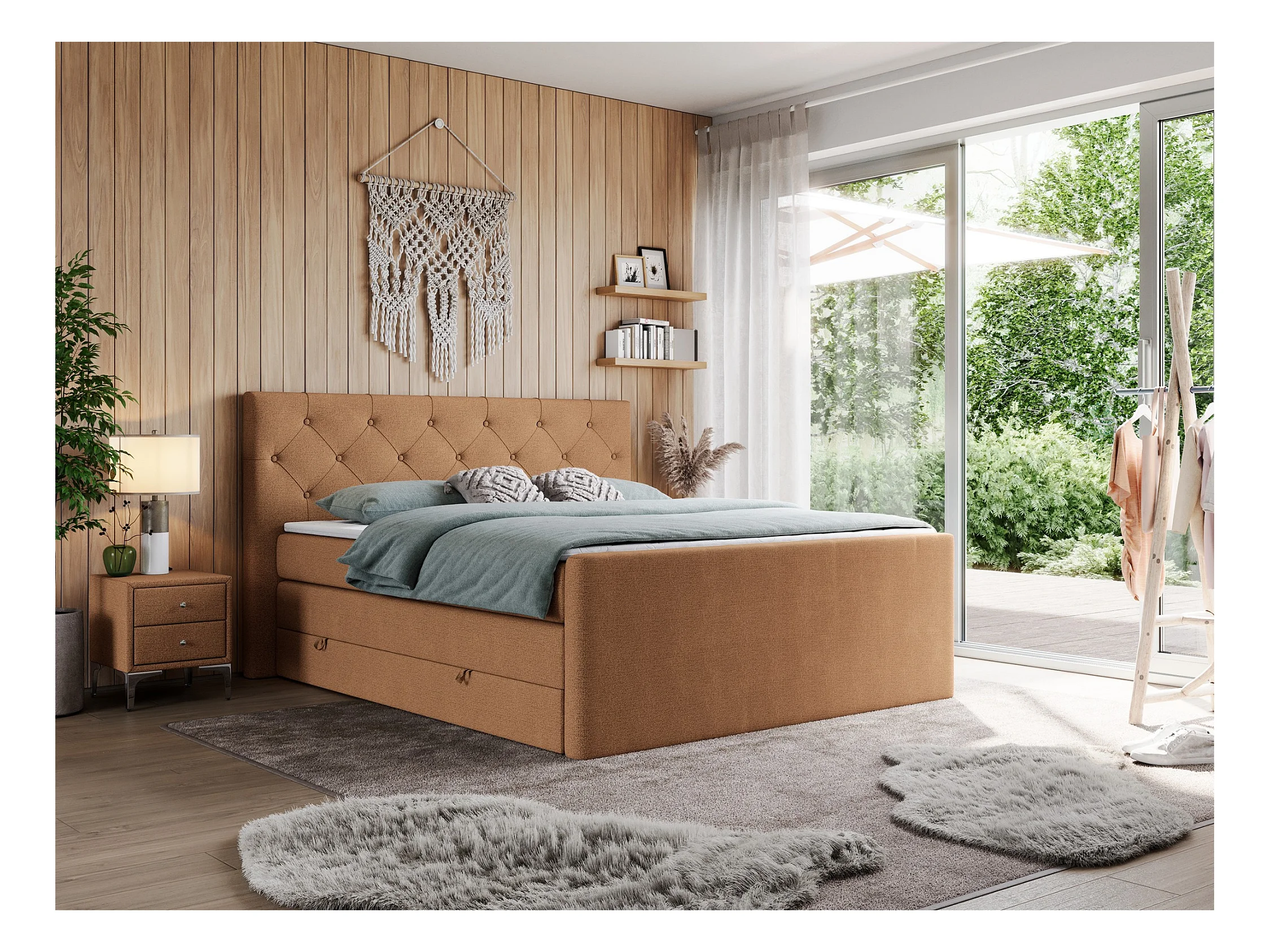 Boxspringbett VELEN KING - Doppelbett mit gestepptem Kopfteil, zwei Multipocket-Matratzen, Polsterbett mit Kopfstütze - 140x200 cm - H3 - Orange Strukture