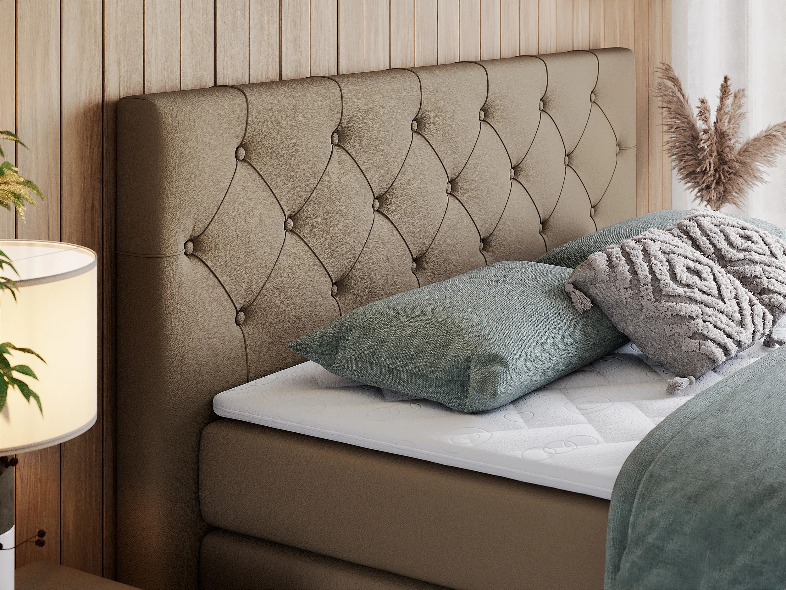 Boxspringbett VELEN KING - Doppelbett mit gestepptem Kopfteil, zwei Multipocket-Matratzen, Polsterbett mit Kopfstütze - 160x200 cm - H3 - Braun Kunstleder